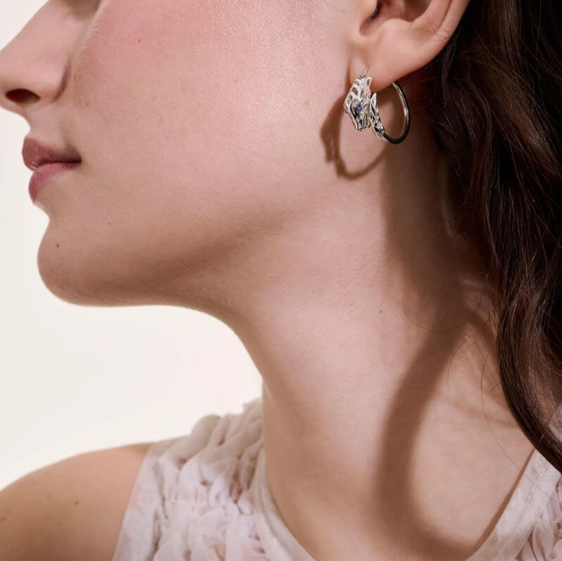 Similar to hoop earrings but much smaller in size, huggie (or huggy) earrings fit snugly over the ears. The classic style of huggie earrings is usually round or oval-shaped, with a post backing that clips closed for an understated yet classic look.
