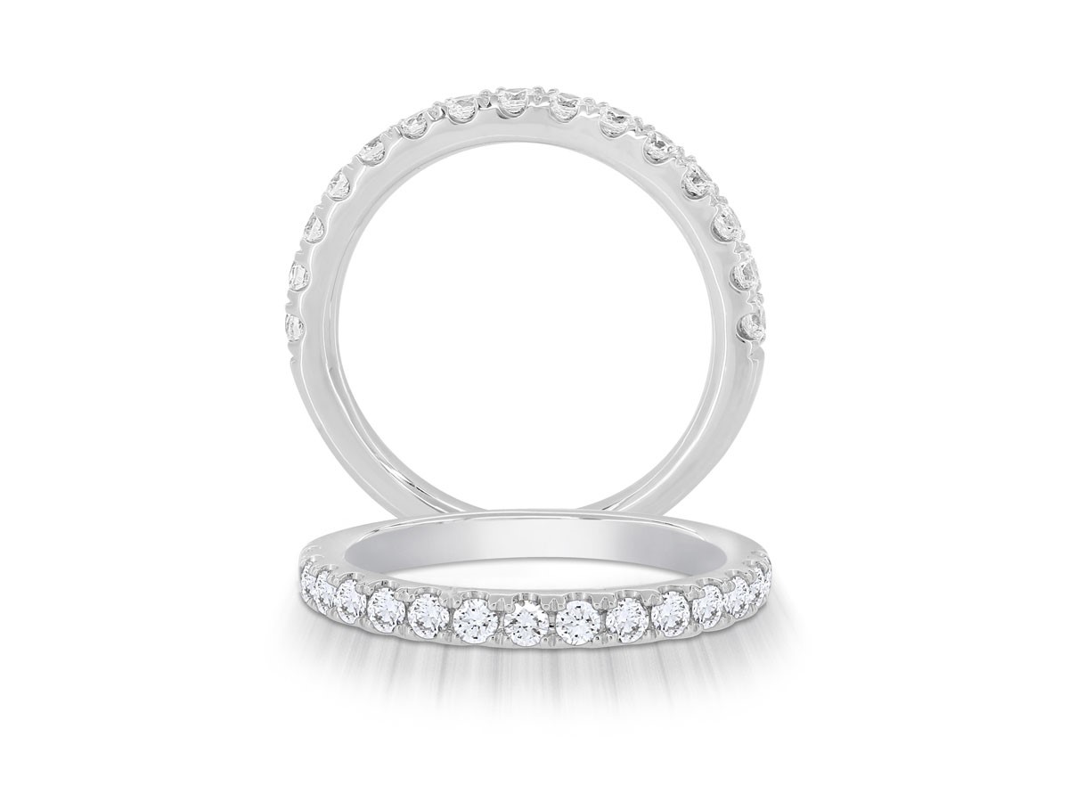 Product Description: Set in polished 14 K white gold, this diamond band features a seamless row of round brilliants in a sleek, shared-prong design. The stones wrap more than halfway around for full-frontal sparkle while keeping the underside smooth and comfortable. Designed to sit flush with most engagement rings, it’s a versatile piece that layers beautifully or stands strong on its own. Clean, timeless, and made to wear every day.