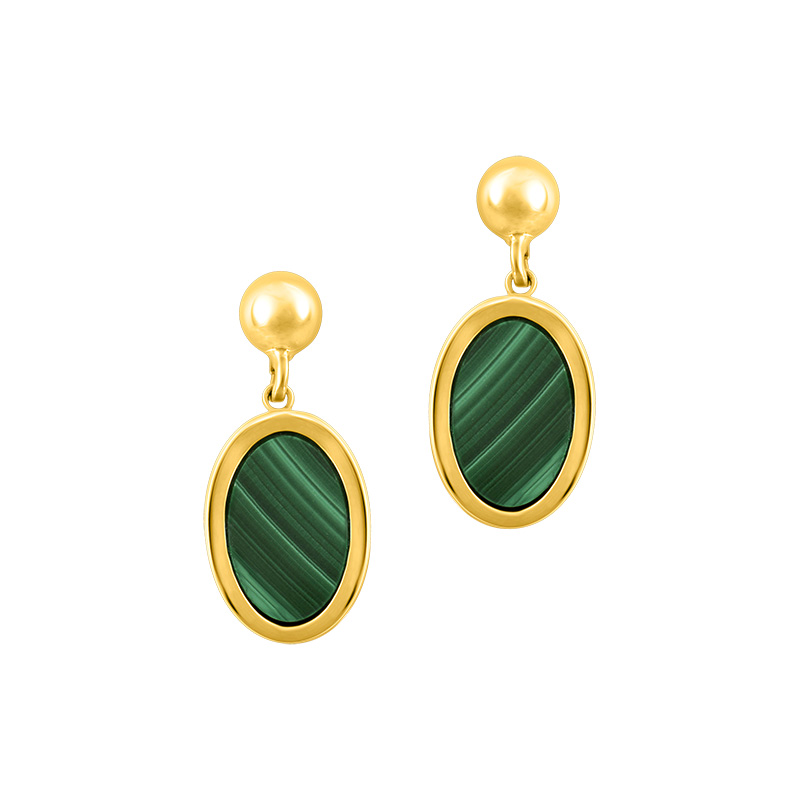 These radiant 14k yellow gold earrings showcase the captivating green hues of malachite stones, striking a balance between bold and elegant. Their lightweight design, at just 1.9 grams, ensures all-day comfort without sacrificing style. The harmonious combination of polished gold and vibrant malachite makes these earrings a standout accessory for any wardrobe, offering a perfect blend of sophistication and natural charm.