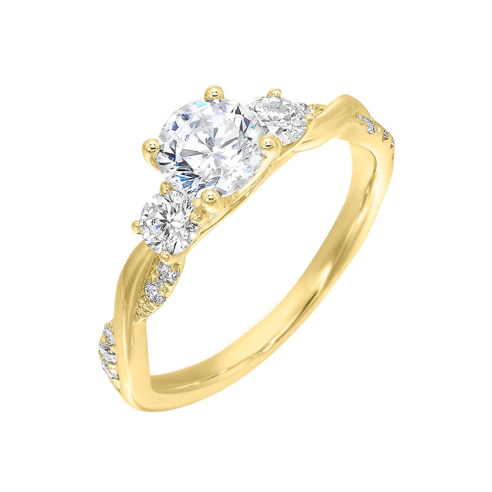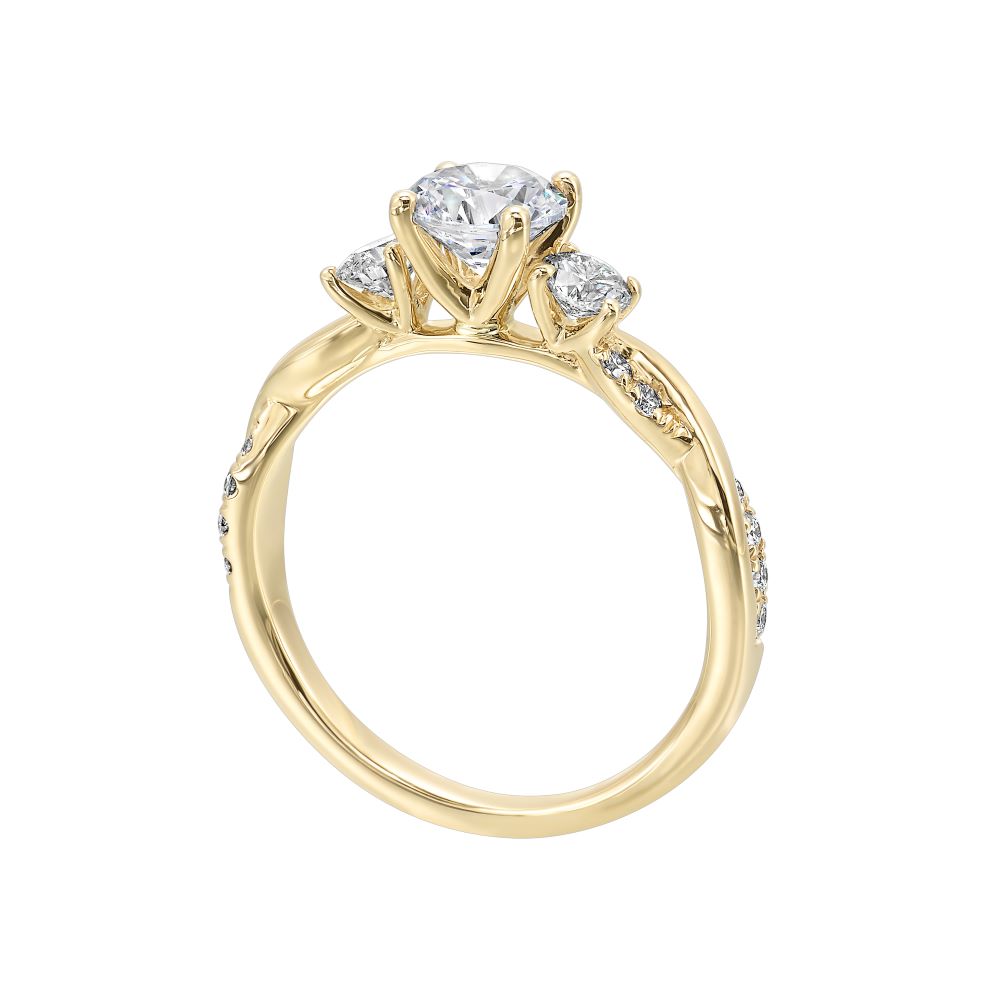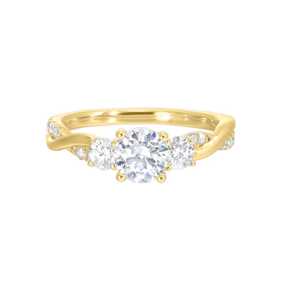 Gracefully blending romantic design with modern polish, this yellow gold engagement ring features a brilliant round center stone flanked by two slightly smaller side stones, forming a luminous trio that symbolizes the past, present, and future. The band gently curves into a soft twist, creating a flowing silhouette adorned with a trail of delicate accent diamonds. These smaller stones are pavé-set to add sparkle without overwhelming the central trio. Feminine, fluid, and full of meaning, this setting balances organic movement with structured brilliance—perfect for someone who values both symbolism and sparkle.