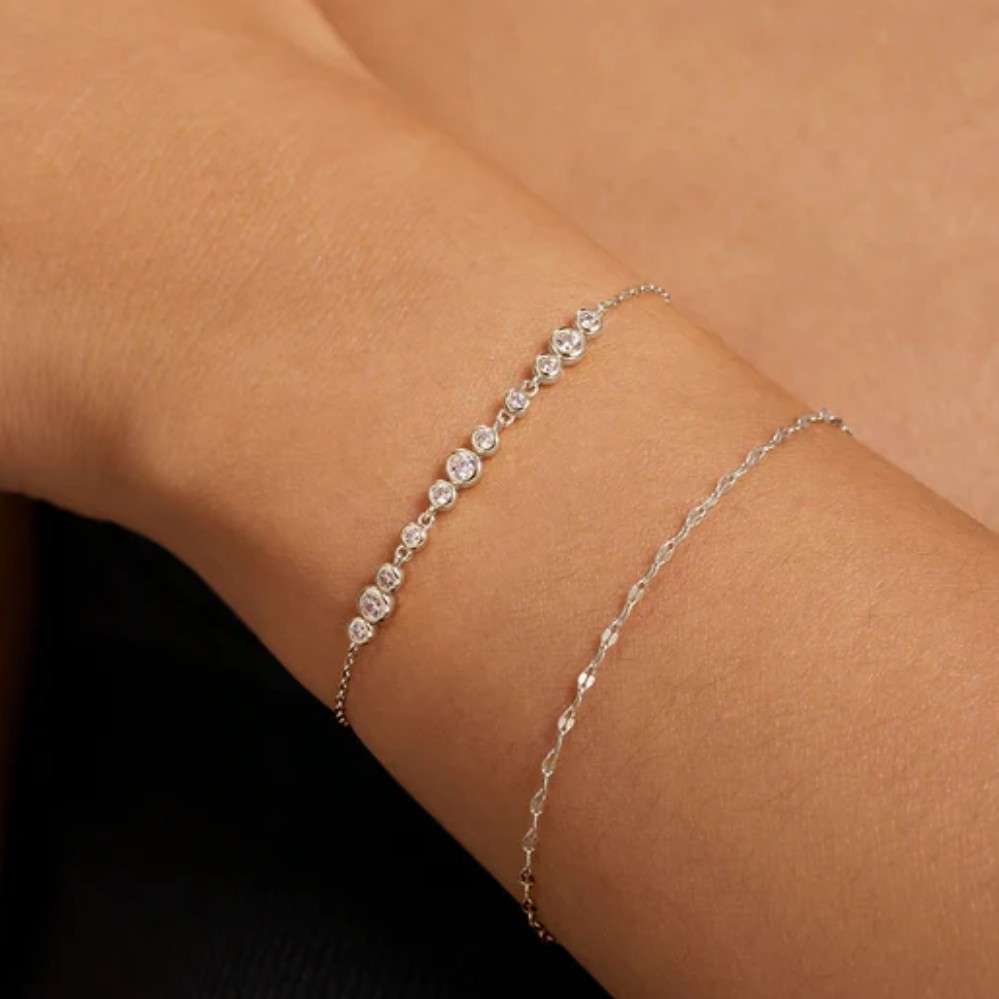 A fine silver-toned chain is accented with bezel-set stones arranged in a softly graduated pattern, creating a gentle flow of light across the wrist. Each round setting offers a clean, modern frame that enhances the subtle sparkle without overwhelming the design. The spacing keeps the look airy and refined, perfect for layering or wearing on its own. An adjustable closure ensures a comfortable, personalized fit.