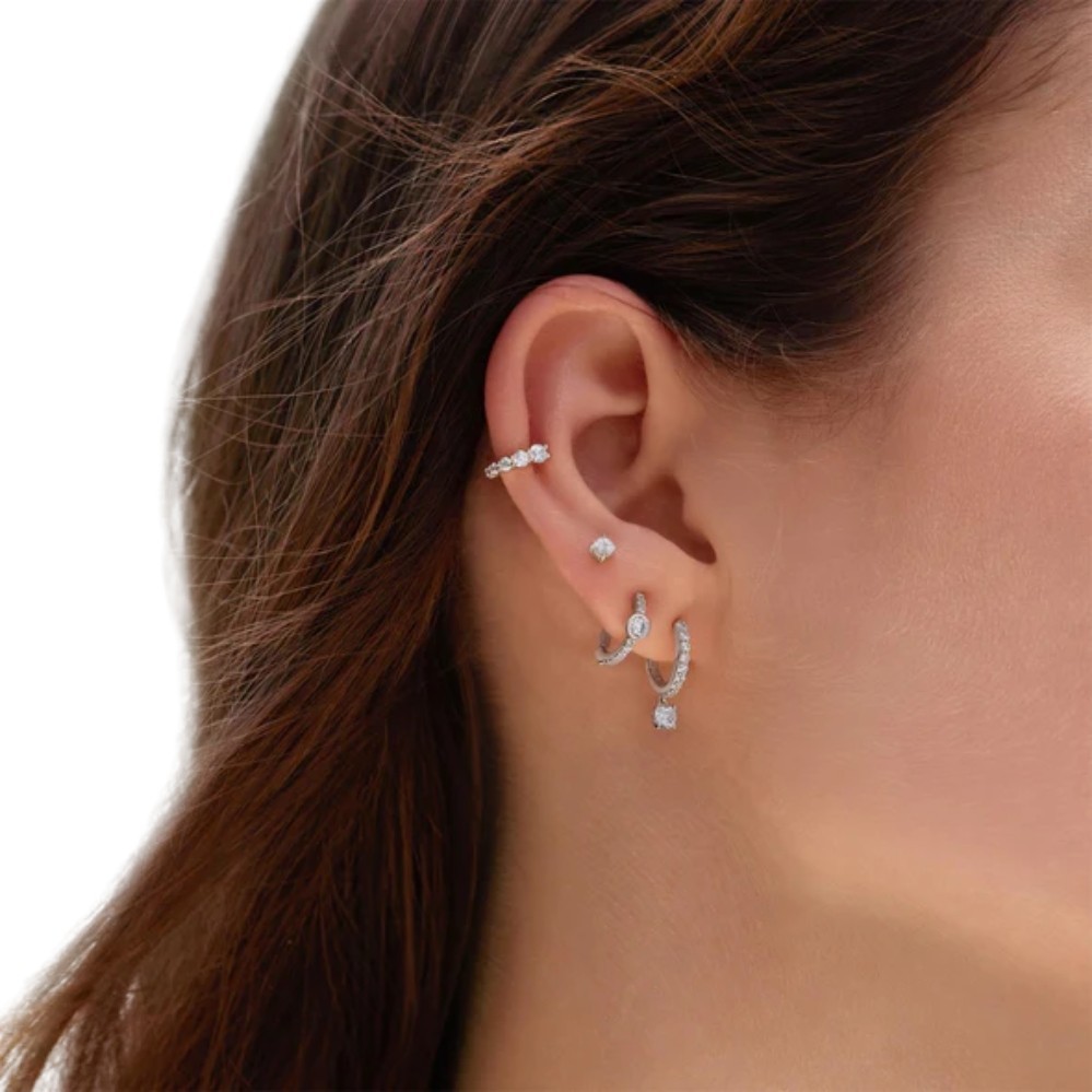A refined row of pavé-set stones lines each hoop, leading to a single bezel-set center that adds a clean, modern focal point. The bright silver finish enhances the brilliance throughout, creating a crisp, luminous look. Designed in a close-fitting huggie style, they offer a secure, comfortable feel while delivering polished sparkle that transitions effortlessly from day to night.