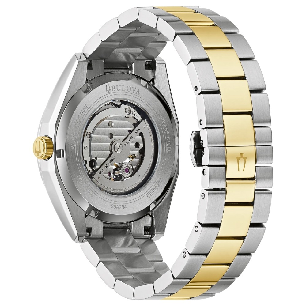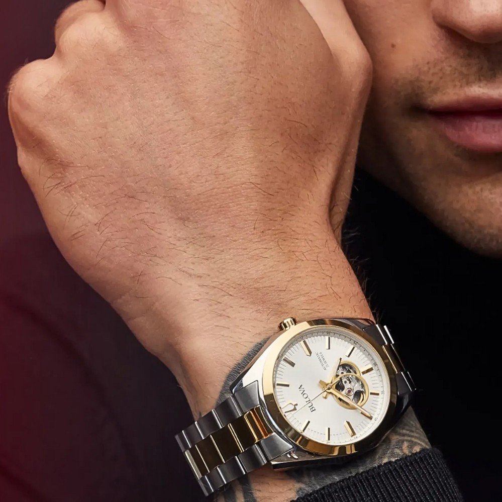 Product Description: A bright silver-tone dial brings a clean, refined presence, accented by warm gold-tone markers and hands that catch the light with every movement. An open-heart aperture offers a glimpse of the automatic movement at work, adding subtle motion without disrupting the balanced layout. The two-tone bracelet flows seamlessly from the case, blending polish and contrast for an elevated everyday look. Classic in feel yet mechanically expressive, the design strikes a confident balance between dress and daily wear.