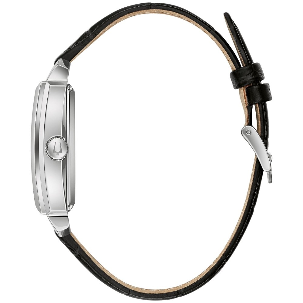The new Sutton Automatic from Bulova introduces a fresh new shape to this classic watch. Inspired by the 1948 Presidentl style, the rectangular stainless steel case has a black textured face with silver-tone accents, with a subtle texture and an open aperture to view the balance wheel of the movement. The case back features a mineral crystal exhibition window, to showcase the automatic movement powering this luxury watch. The case is paired with a rich black alligator-grain leather strap for an elegant statement. For anyone seeking a classic timepiece with a distinct personality, this is a piece that can’t be overlooked.