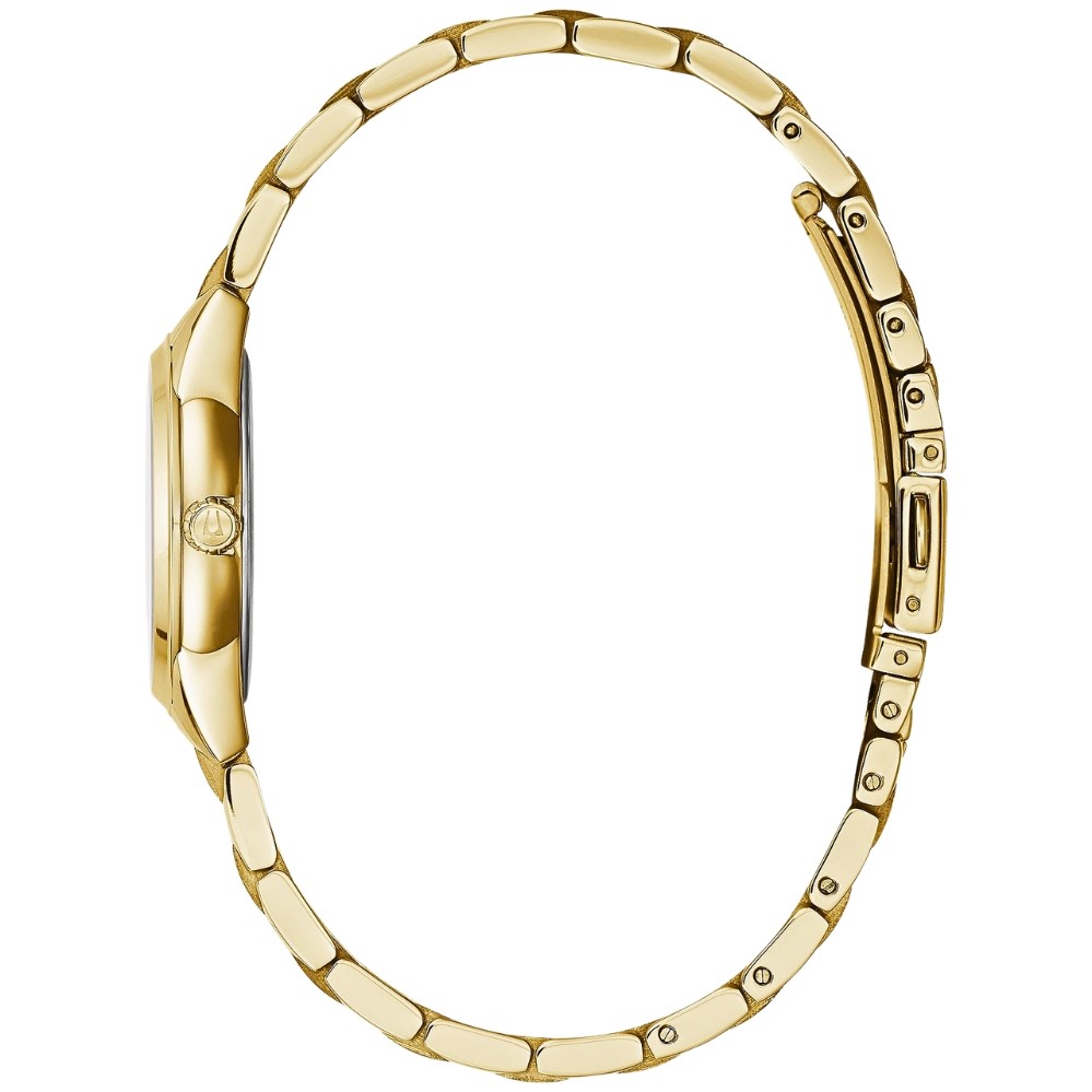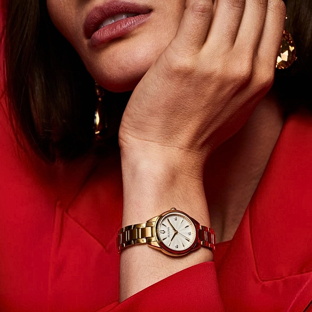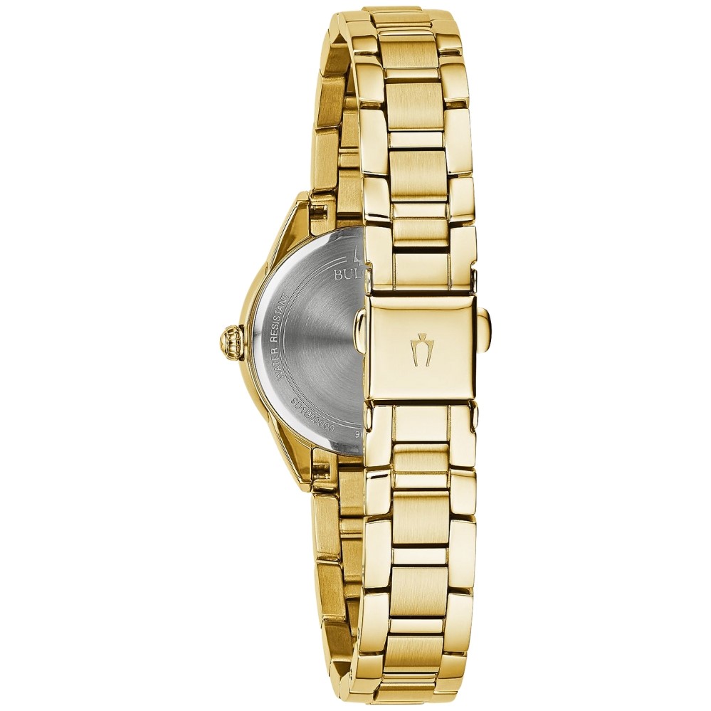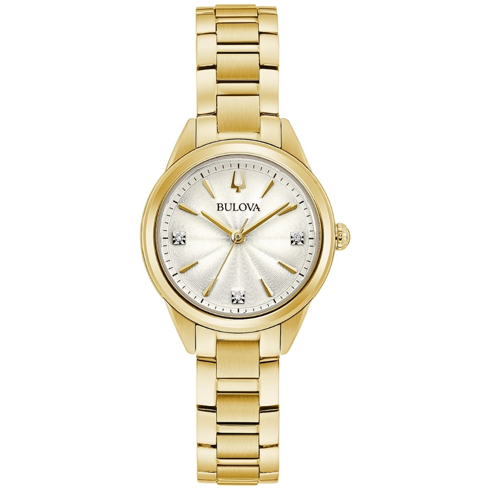 Product Description: A warm gold-tone finish gives this timepiece a refined, feminine presence on the wrist. The silver-white dial features a subtle sunray texture that radiates outward, catching light with soft dimension. Slender gold-tone markers are accented by crystal-set hour details, adding delicate sparkle without overwhelming the clean design. Finished with a coordinated bracelet and classic three-hand quartz movement, it offers polished everyday wear with just the right touch of brilliance.