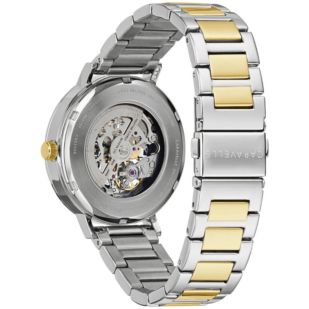 A silver-tone stainless steel case houses a black sunray open-aperture dial that reveals the 21-jewel automatic movement beneath. Gold-tone hands and hour markers contrast sharply against the dark background, lending the watch a stylish two-tone aesthetic. The bracelet combines polished gold-tone links with steel, and a screw-back exhibition case lets you view the skeletonized mechanics in motion. With a water resistance of 50 m, it’s designed for both elegance and everyday wear.