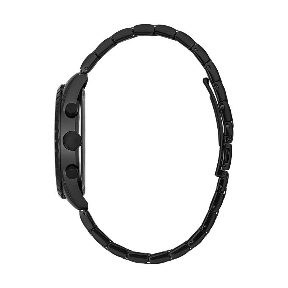 Product Description: A stealthy, all-black finish gives this chronograph a strong, modern edge with a distinctly urban feel. The matte dial is layered with bold Arabic numerals and recessed subdials, creating depth while maintaining clear legibility. Subtle contrast markers and crisp hands keep the layout functional without breaking the monochromatic look. Finished on a matching black bracelet, the watch wears with a confident, sport-forward presence designed for everyday impact.