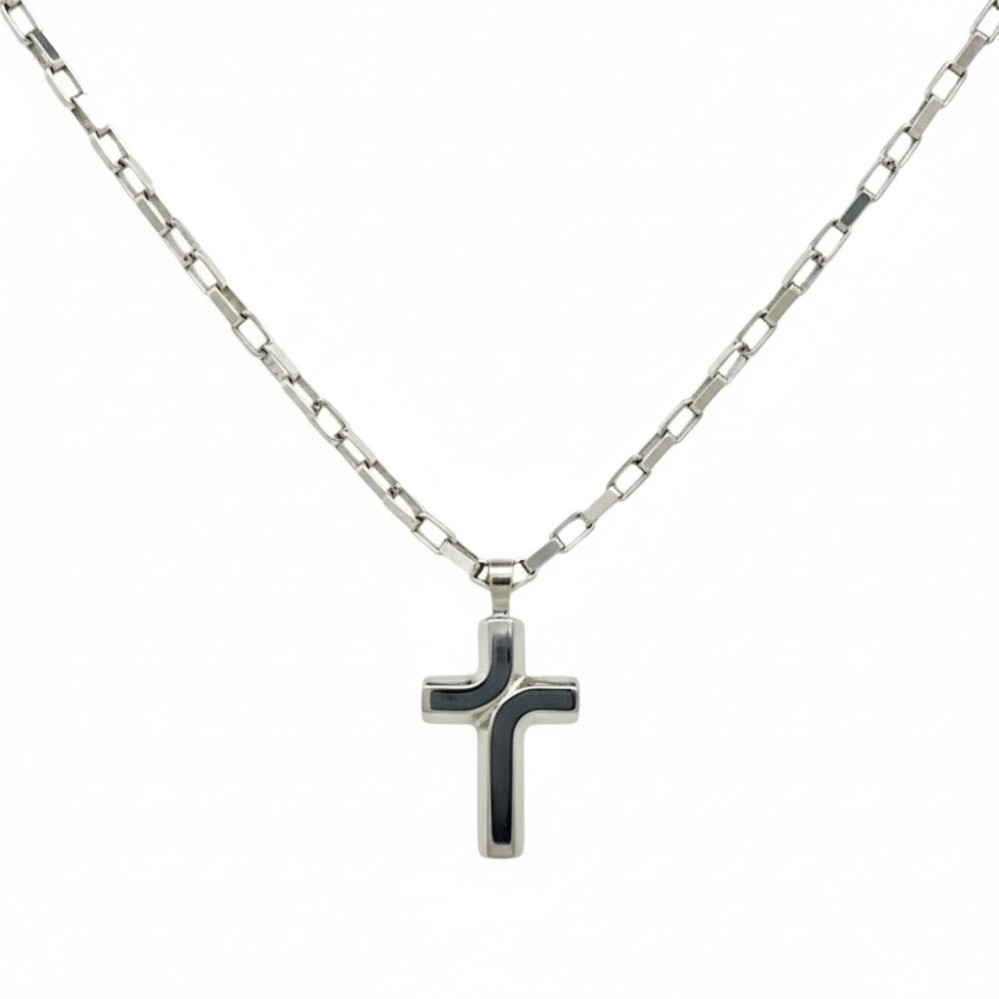 Product Description: A clean, modern cross pendant anchors this stainless steel design with confident simplicity. The polished surface is accented by a contrasting dark inlay that adds depth and subtle…