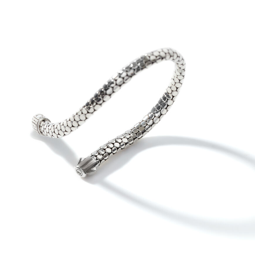A sculptural rhythm of raised sterling silver dots wraps the wrist with a bold yet refined presence. Each polished element catches light independently, creating depth and texture across the flexible silhouette. The pattern feels substantial without appearing heavy, offering a confident statement that layers effortlessly or stands alone. A discreet hinged clasp integrates seamlessly into the design, reinforcing its clean, continuous flow. Crafted for everyday wear, the look balances artisanal detail with modern restraint.