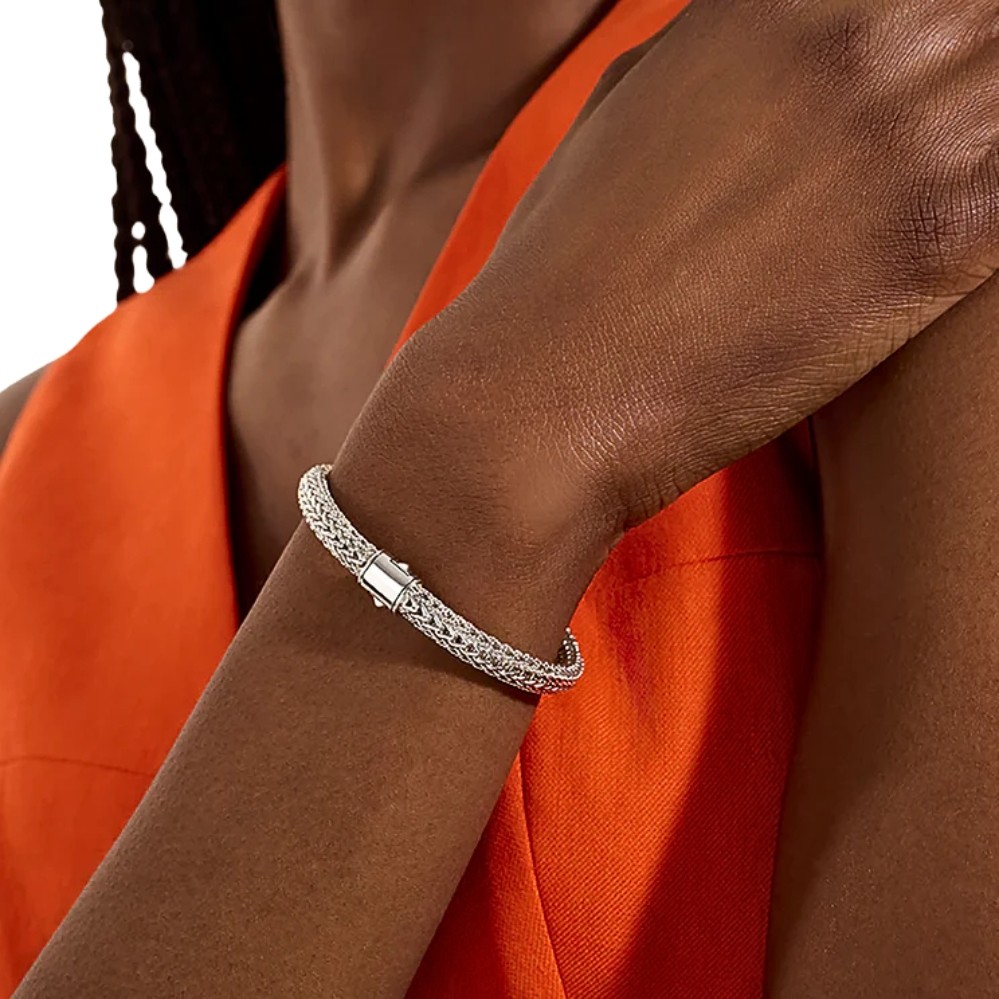 A reversible woven design gives this bracelet a refined versatility. One side shows a cool silver-tone chain with a tight, intricate pattern; flip it over and the opposite edge reveals a warm gold-tone braid for an elevated contrast. The clasp sits flush within the weave, adding a smooth, tailored finish. Its clean lines and subtle dimension make it an easy piece to wear alone or stack for a more expressive look.