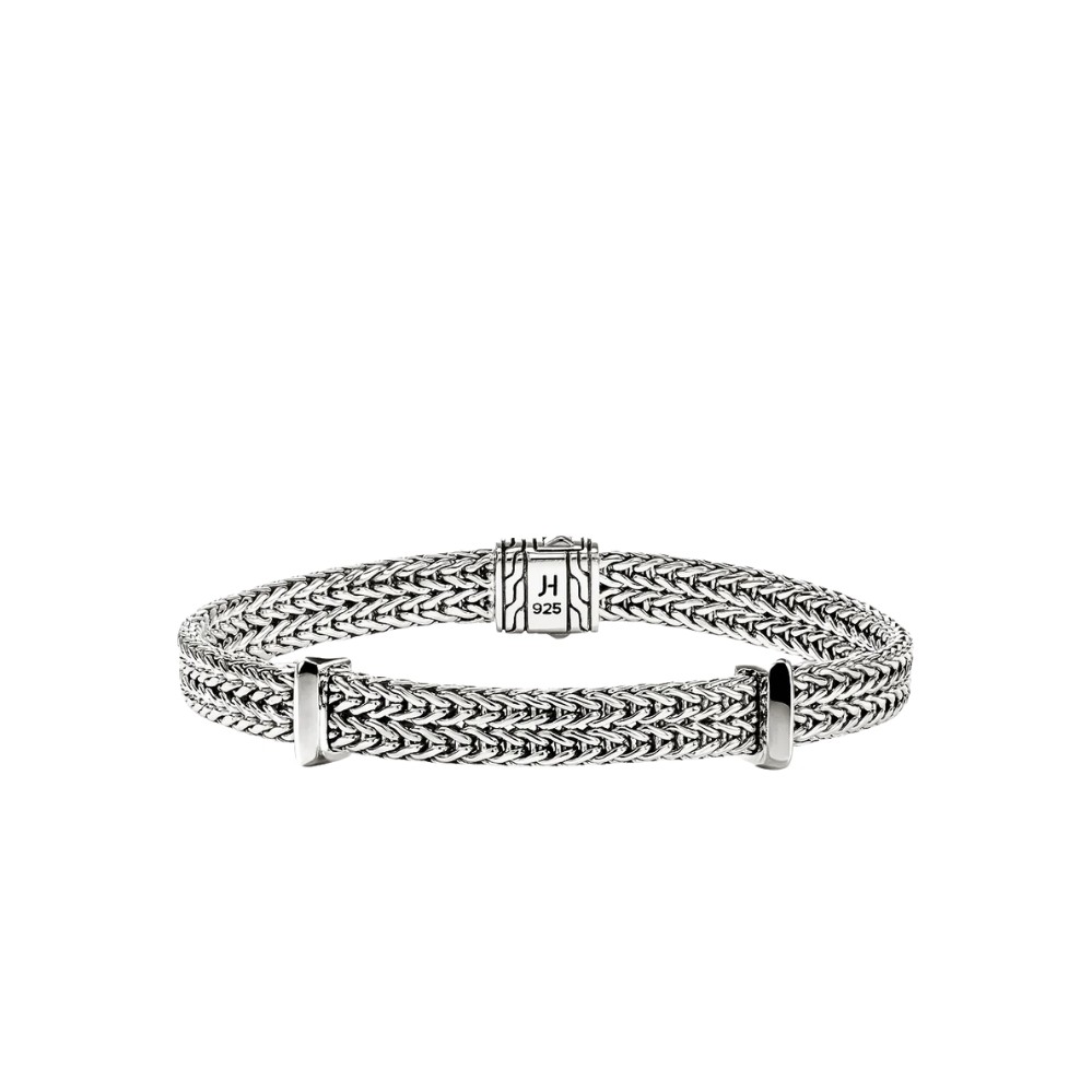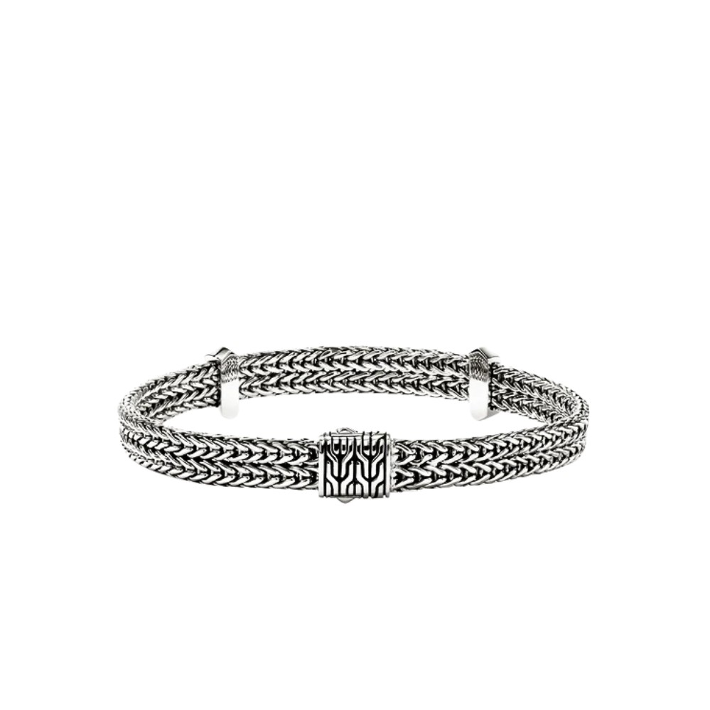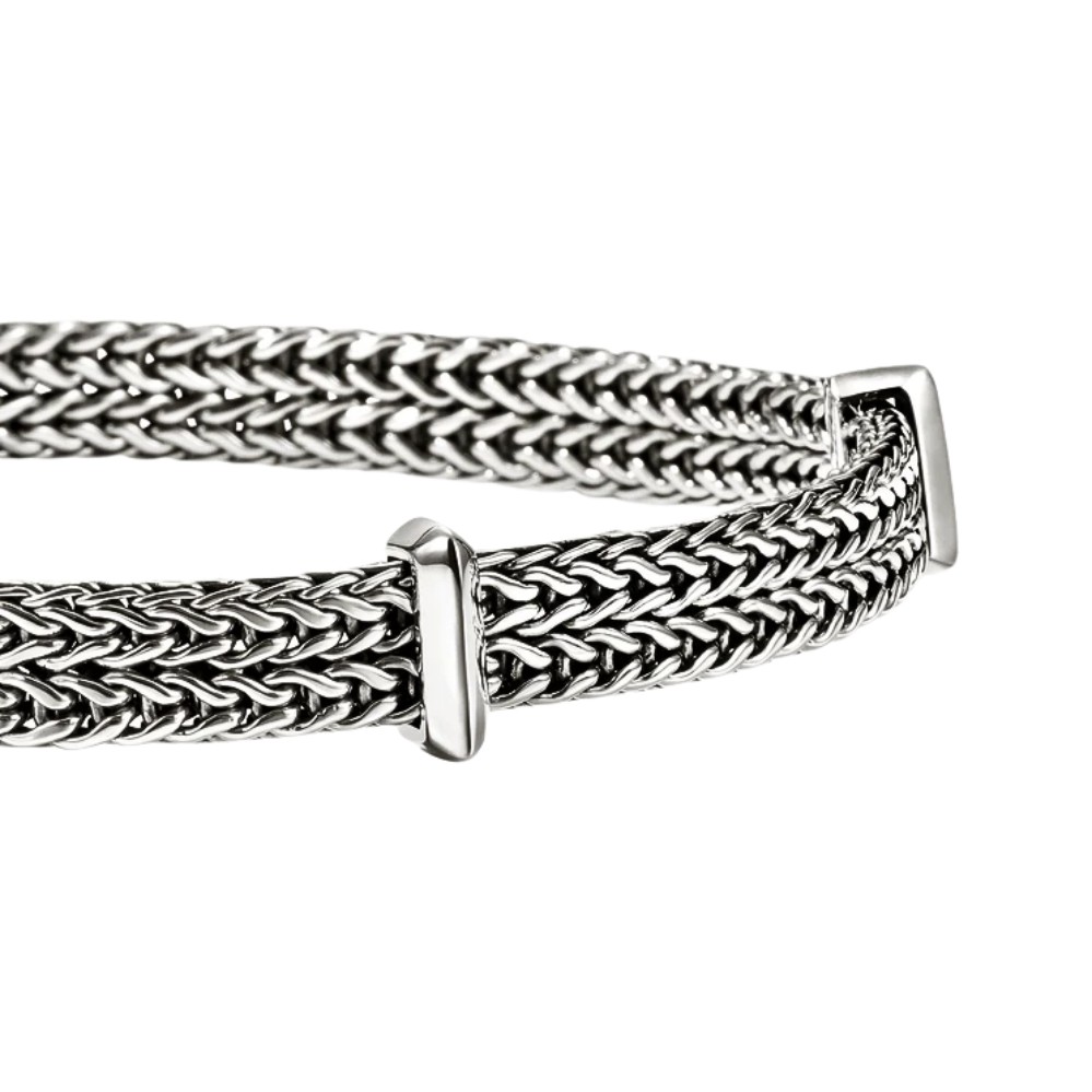 The bold weave of sterling silver brings refined strength to this bracelet, highlighted by its double-link design that radiates texture and shine. Crafted with careful attention to detail, it features smooth polished stations that frame the iconic clasp, balancing intricacy with clean, contemporary lines. The result is a versatile piece that blends everyday wearability with timeless sophistication, making it an ideal choice for stacking or as a standout statement on its own.