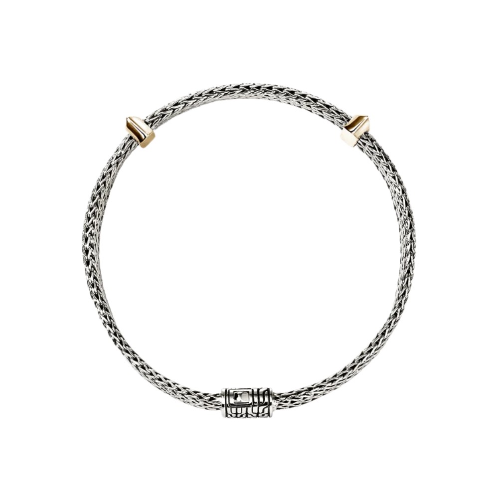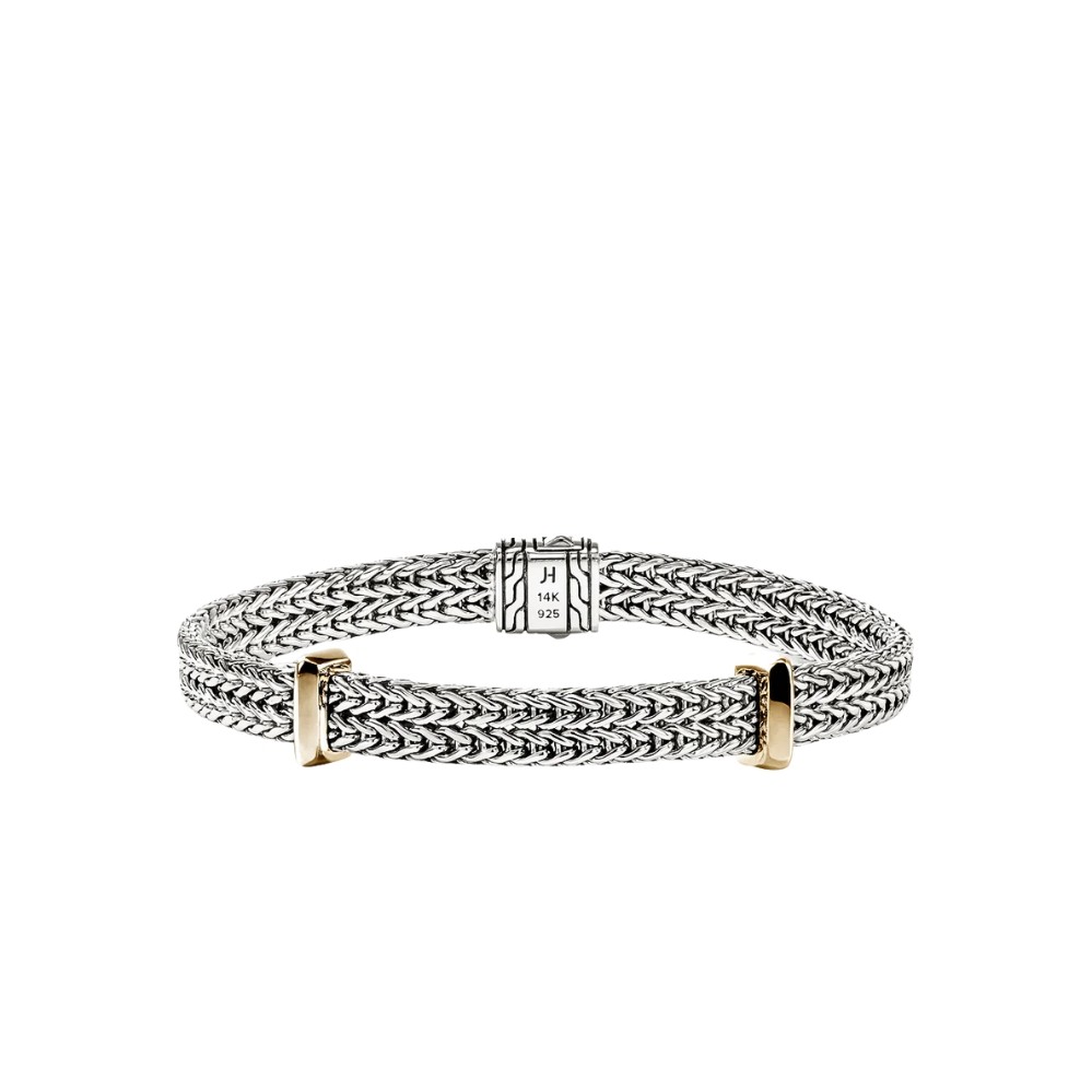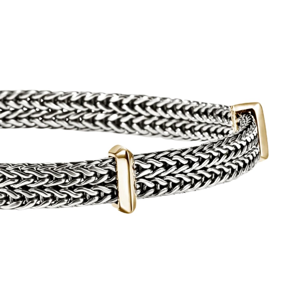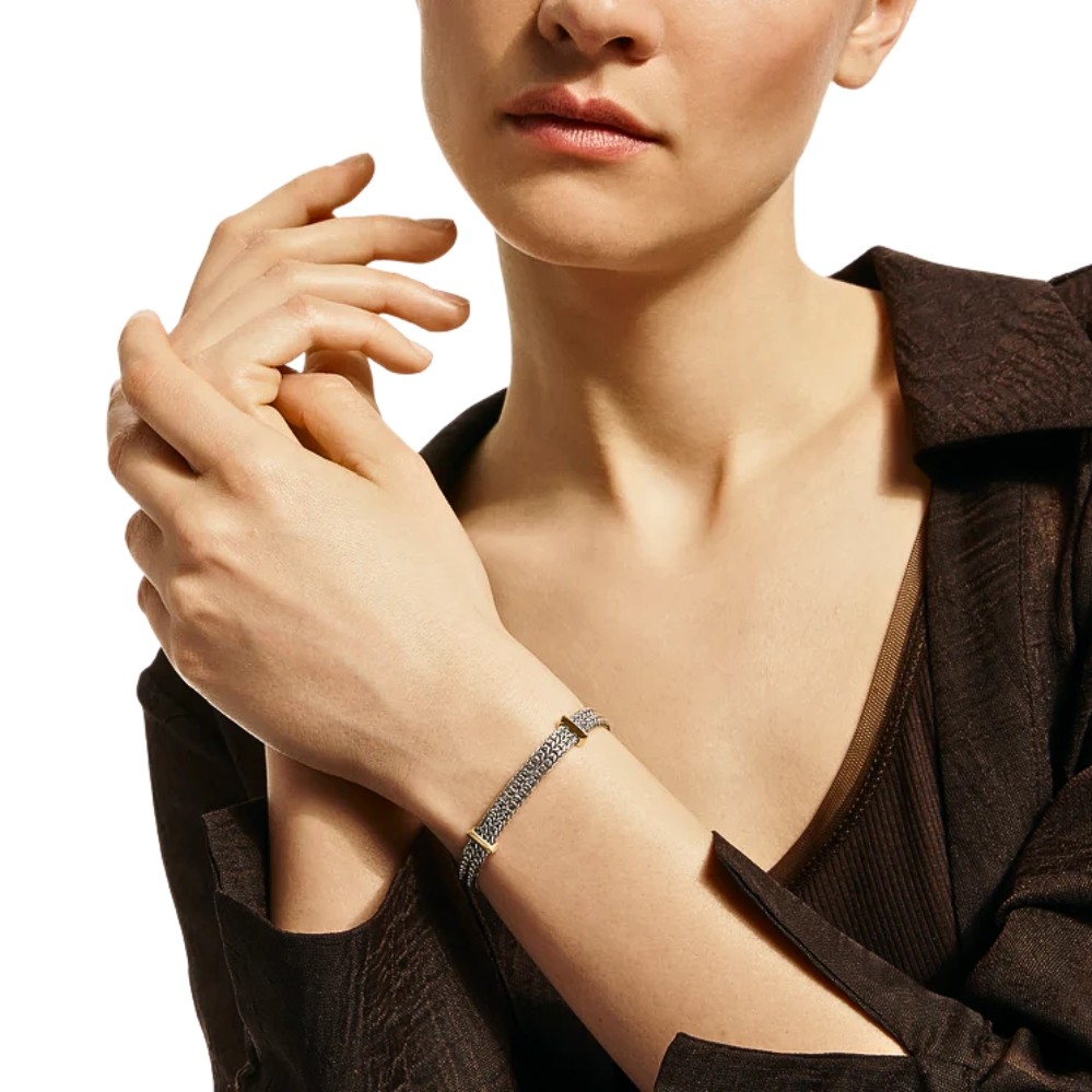 Bold woven sterling silver forms a wide band, its intricate texture creating striking depth and movement. Polished 14K yellow gold stations provide refined contrast, enhancing the bracelet’s structured silhouette. The secure clasp ensures comfort and reliability, while the balance of strength and elegance makes it a timeless piece for everyday wear or layered styling.