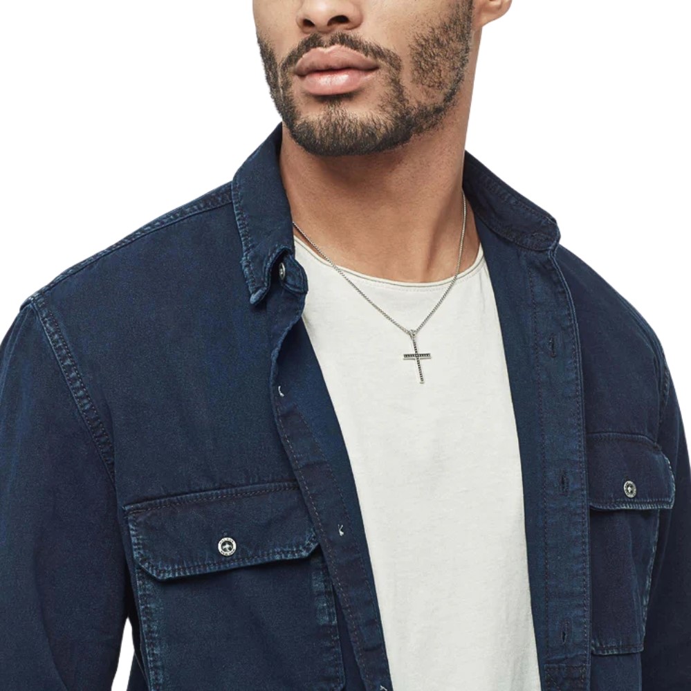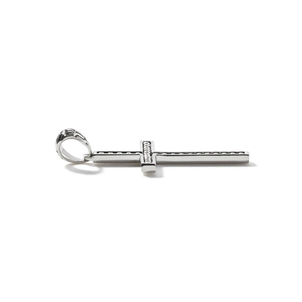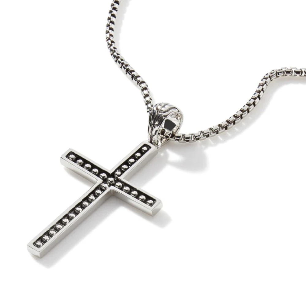 A sculptural expression of timeless symbolism, this piece fuses refined craftsmanship with contemporary edge. Its bold, geometric silhouette is softened by high-polish sterling silver, while the darkened interior channel — punctuated by precisely spaced spherical accents — adds a sense of depth and quiet intensity. The contrast between brightness and shadow gives it an arresting presence without relying on ornamentation. Up close, the hand-carved detailing at the bail reflects a lineage of traditional design, but the overall feel is clean and modern. Designed to feel grounded but not heavy, it’s a considered statement — something that speaks to personal conviction, individuality, and a sense of connection. Whether worn alone or layered, it stands as a quiet anchor with lasting impact.