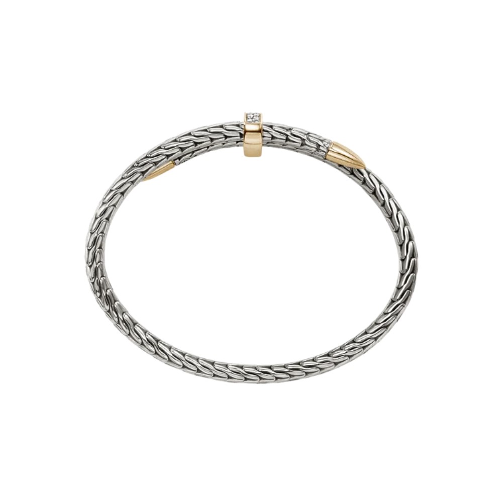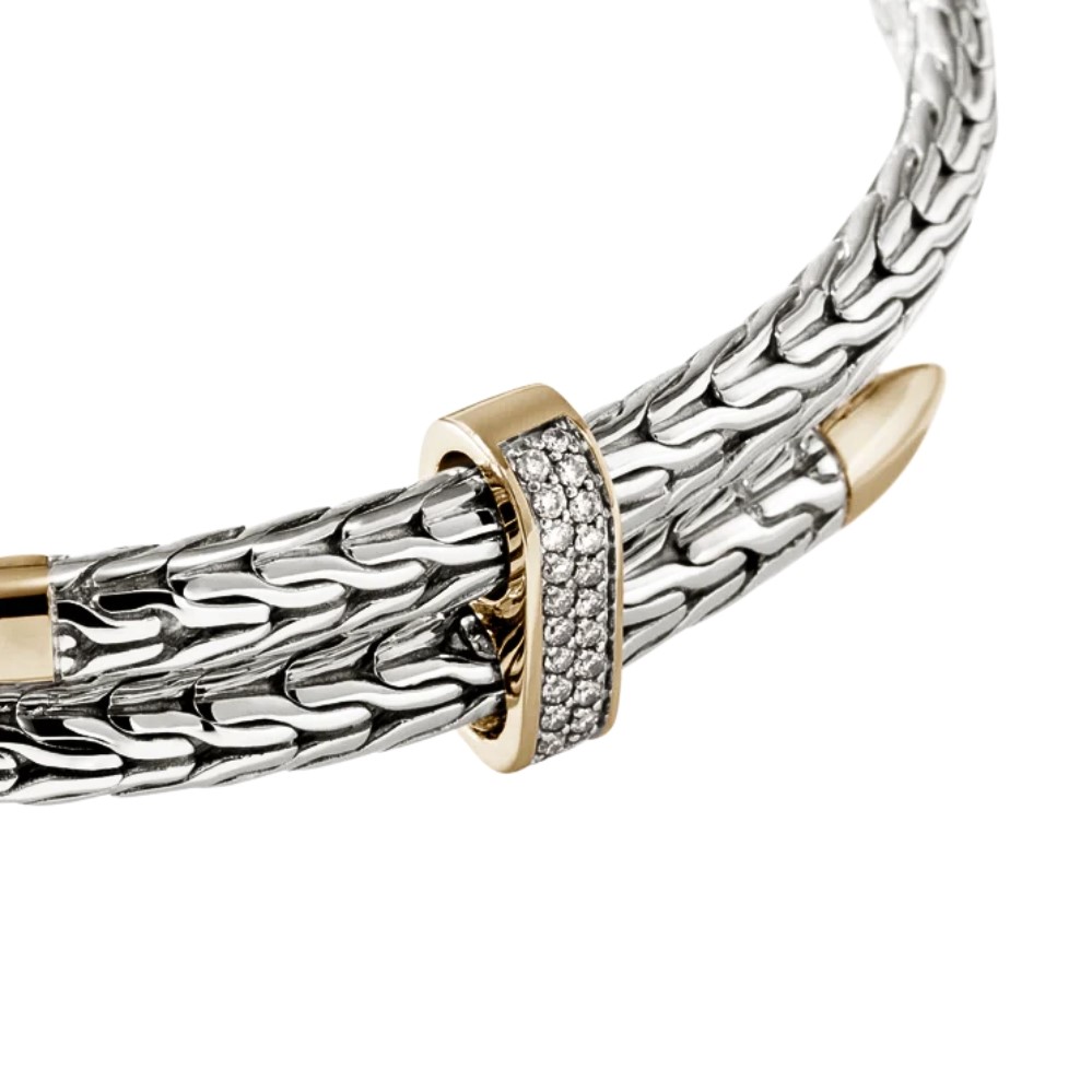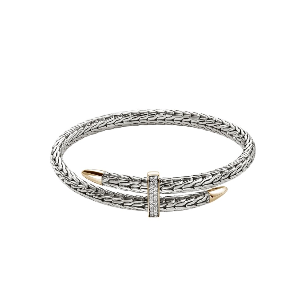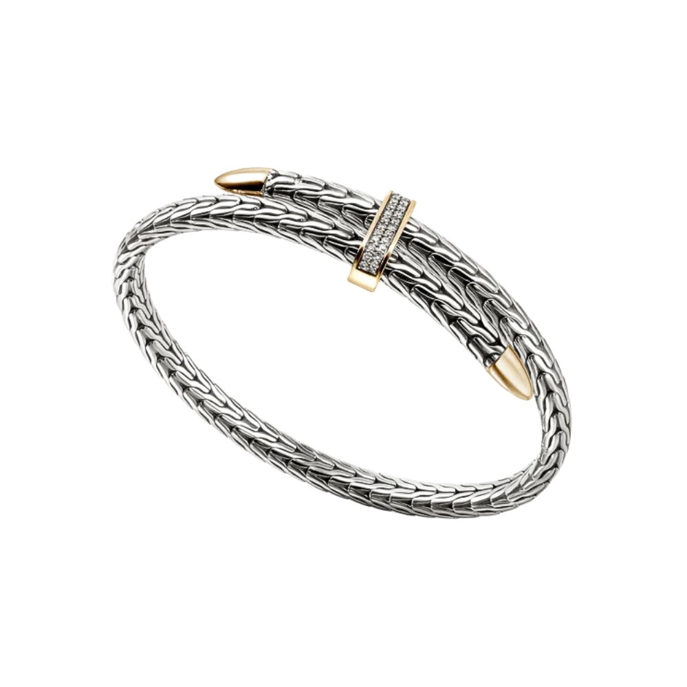 Bold and refined, this flexible cuff bracelet from the Spear Collection channels strength through its intricate weave and striking contrast of sterling silver and bonded yellow gold. A bar of pavé-set white diamonds adds brilliant dimension, anchored between precision-tapered spearpoints that symbolize forward momentum. Built with a flexible, easy-wear design, it fuses traditional Balinese artistry with contemporary edge, making it a powerful everyday statement.