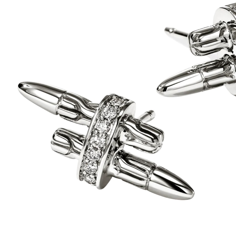 Striking and sculptural, these sterling silver stud earrings embody a balance of strength and refinement. Each earring features John Hardy’s signature spear motif accented with a horizontal band of pavé-set diamonds, adding a radiant edge to the bold silhouette. Their polished finish and geometric design lend a modern architectural feel, making them a versatile statement for both day and evening wear. Diamond color and total weight not specified.