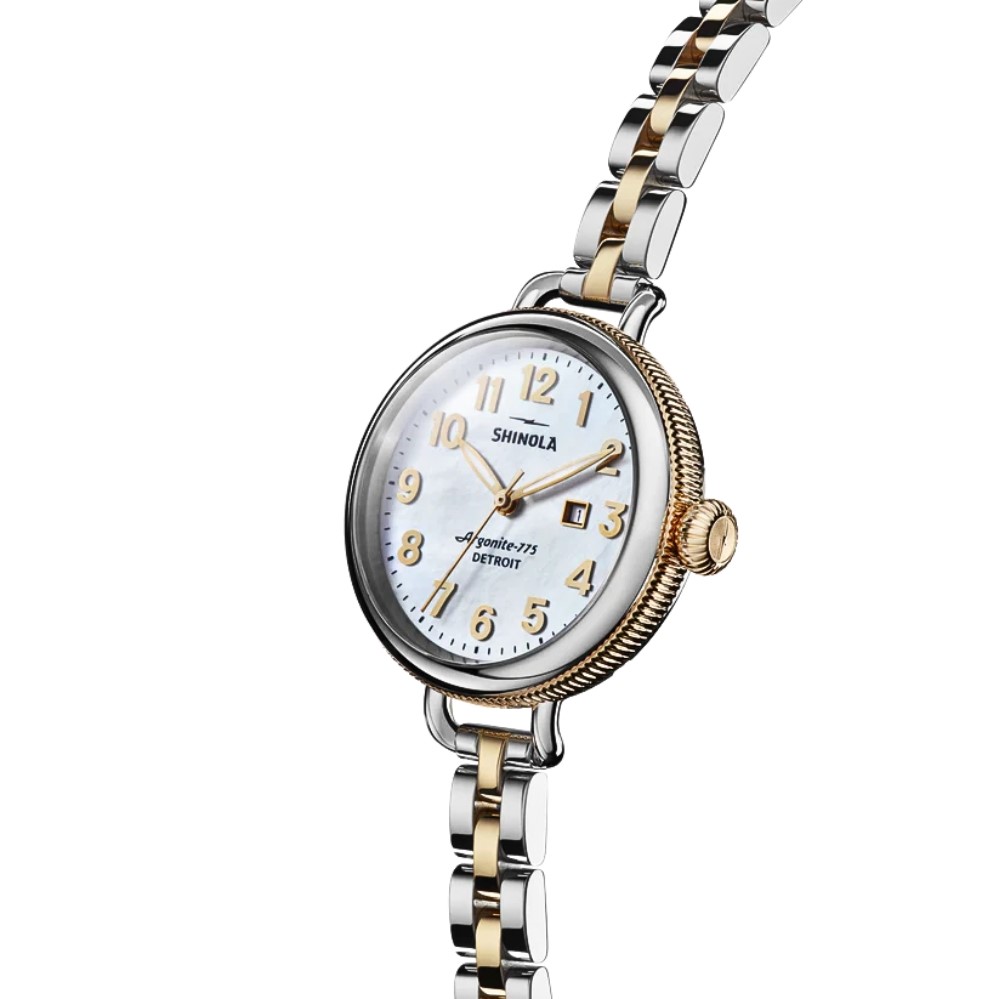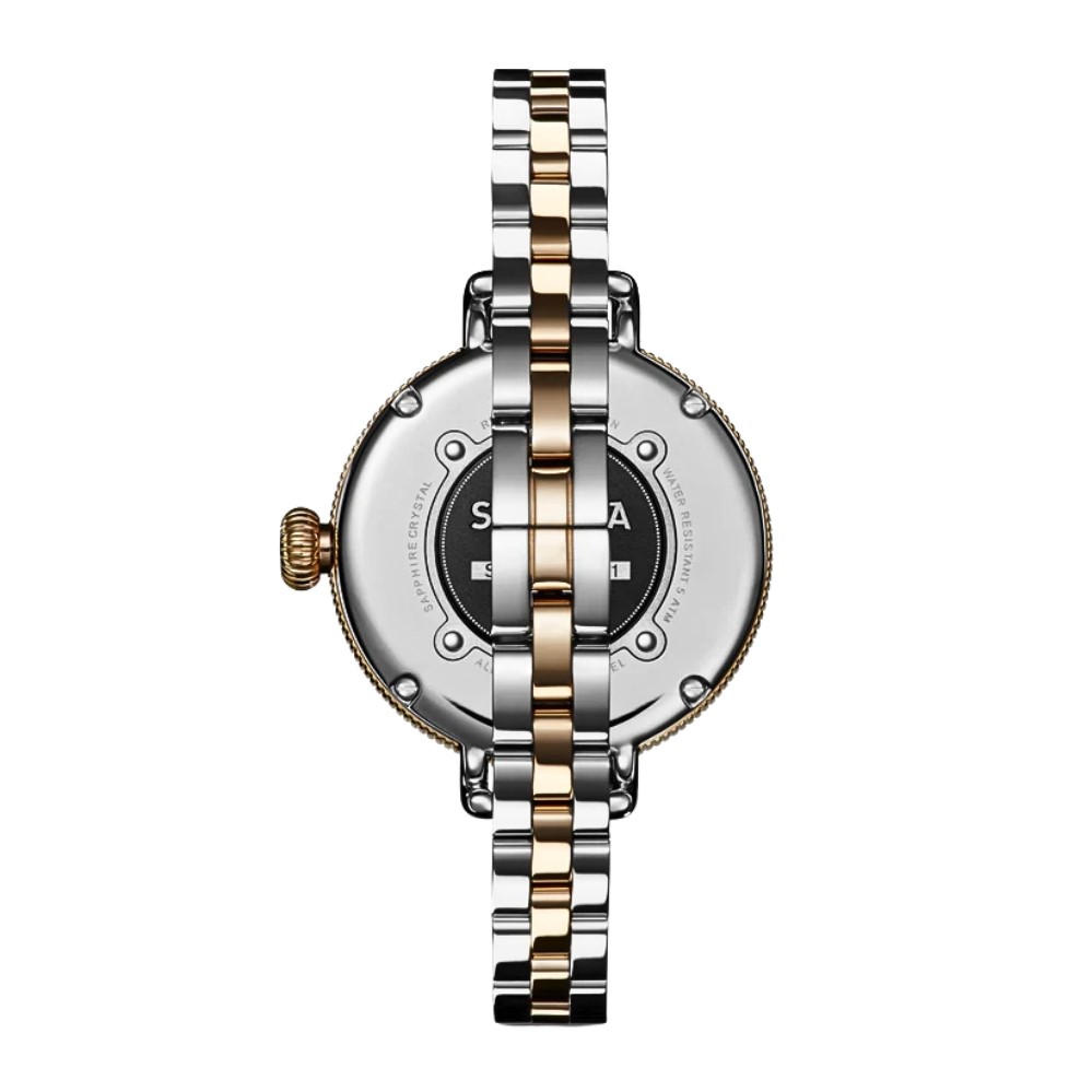This timepiece exemplifies timeless craftsmanship and elegant design. A white mother of pearl dial is framed by a polished stainless steel case with gold PVD coin edge detailing, while a durable double-domed sapphire crystal enhances both clarity and protection. Powered by a high-accuracy quartz movement, this piece offers precision down to 15 seconds per month. The bracelet is crafted from polished stainless steel and gold PVD, adding refinement and versatility, making it a stylish addition to any wardrobe.