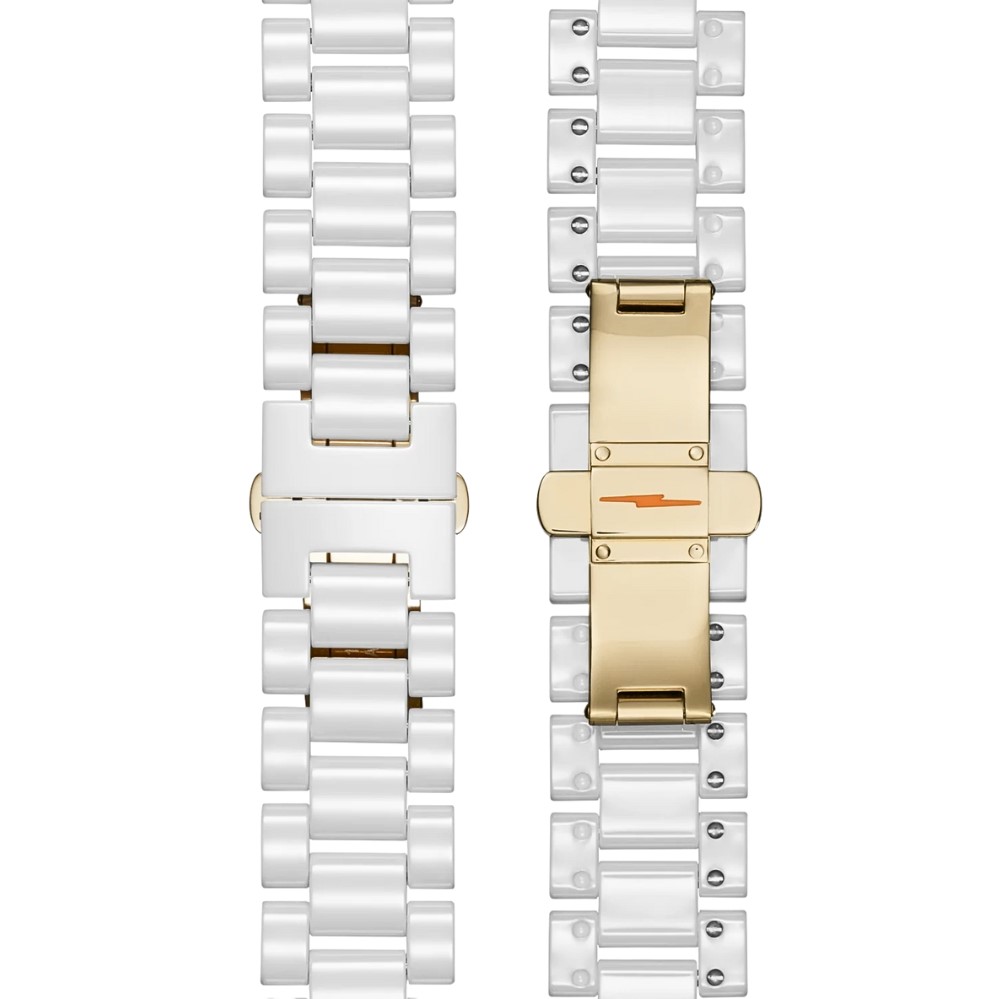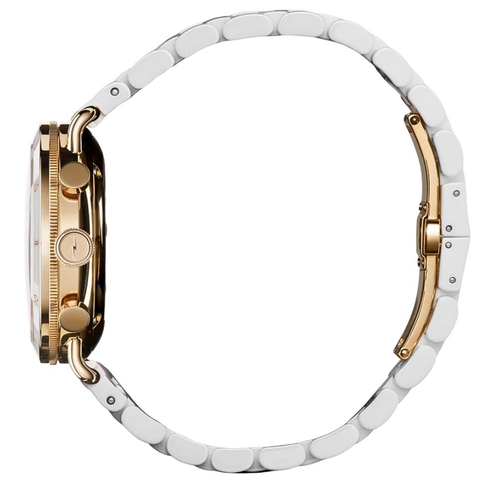 Combining sharp design with modern performance, this striking timepiece brings together a clean, white aesthetic with gold-tone accents for a truly refined look. The smooth ceramic bracelet flows seamlessly into a polished stainless steel case, framing a crisp dial with precision chronograph subdials and a date display for added function. Blending elegance with sport sensibility, it’s the ultimate expression of versatility—ready for everyday wear or dressed-up moments alike.