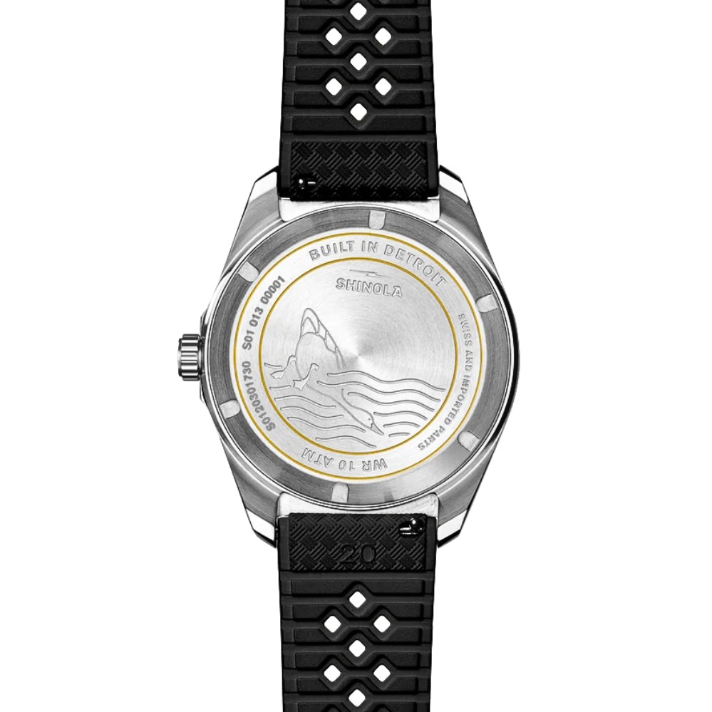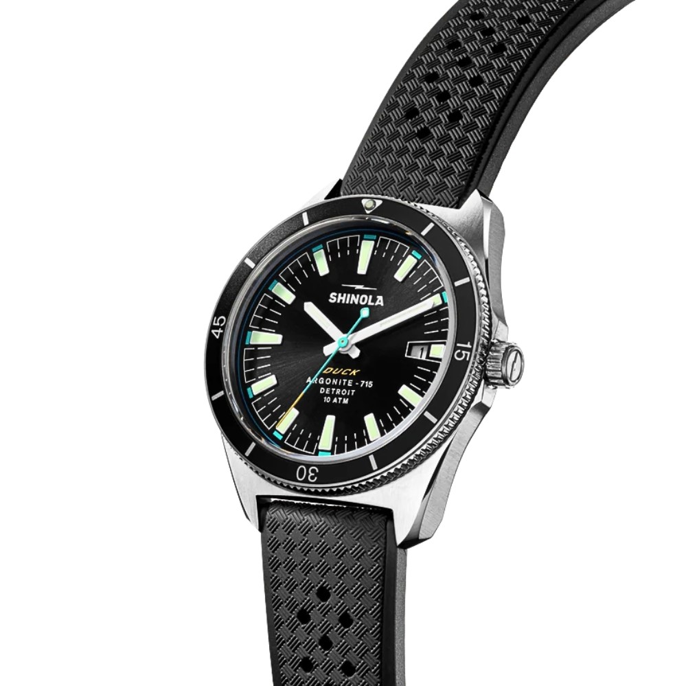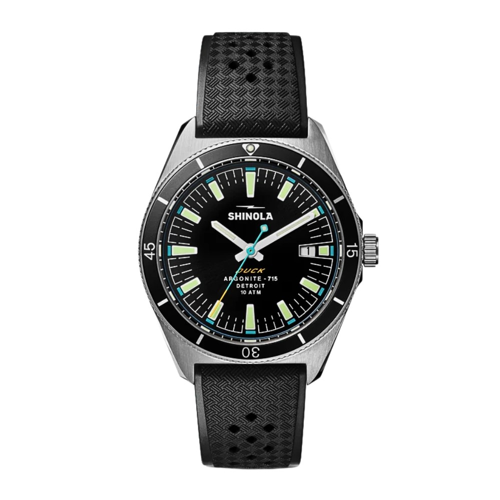 Designed for the bold and built for the elements, this dive-ready timepiece merges athletic durability with Shinola’s signature Detroit craftsmanship. A striking black dial is illuminated by bright Super-LumiNova indices and hands, delivering exceptional legibility above or below the surface. The stainless steel case is paired with a resilient black rubber strap for ultimate comfort and grip, while the 100-meter water resistance and screw-down crown ensure it’s ready for any aquatic challenge. Finished with a rotating bezel and reliable quartz movement, it’s a sport watch made to keep pace with adventure.