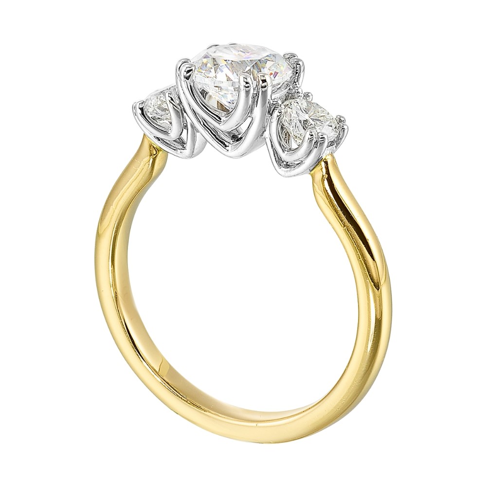 A luminous round center is framed by a pair of graduated accent stones, creating the classic three-stone silhouette that symbolizes a couple’s past, present, and future. The setting’s white-metal prongs (rhodium-plated 14K) maximize brilliance, while the high-polish yellow-gold shank adds warmth and contrast. Tapered shoulders draw the eye straight to the sparkle, making this design perfect for the bride who loves timeless elegance with just a hint of contemporary color.
