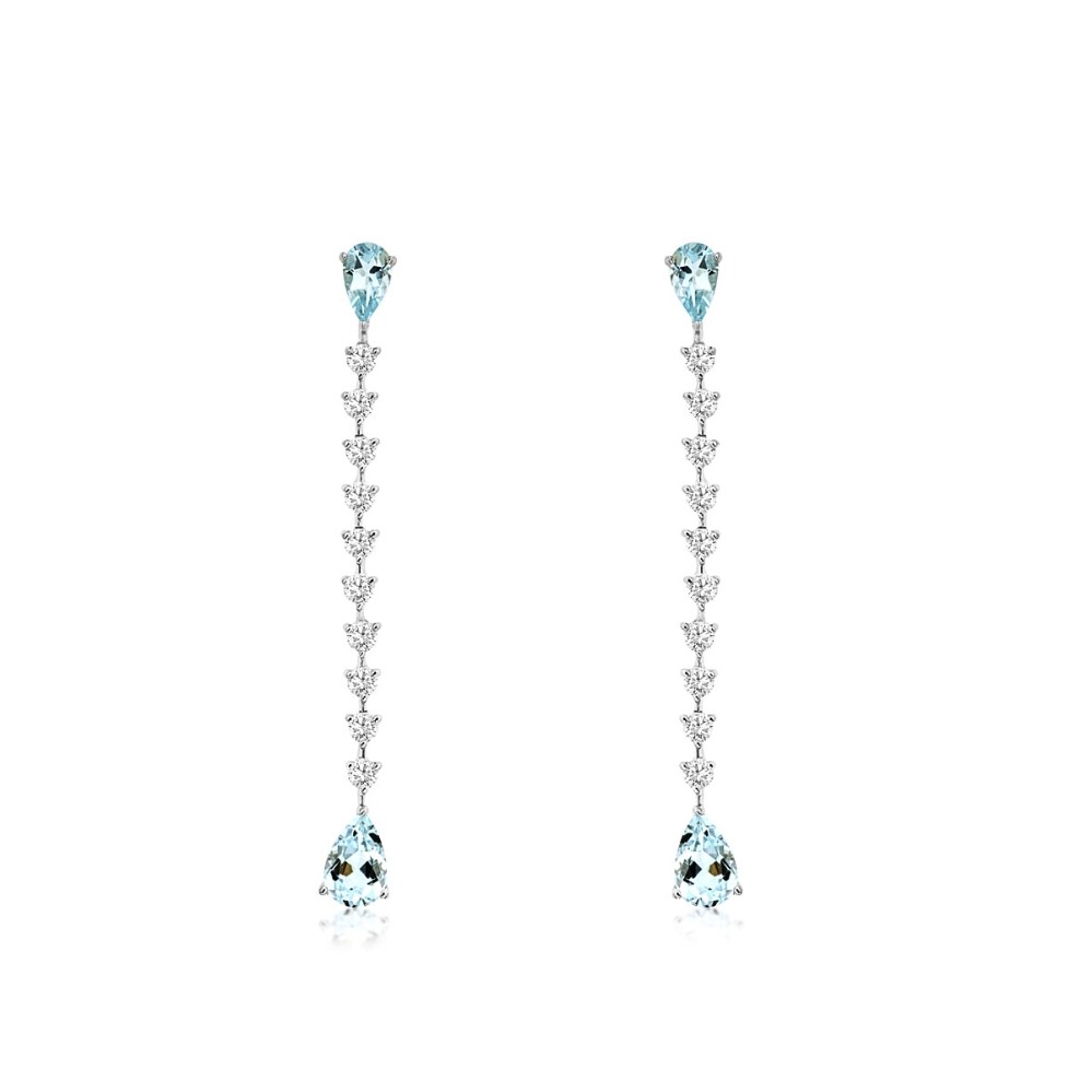 A pair of elongated drop earrings that exude serene sophistication. Each earring features a delicate line of round diamonds cascading downward, leading to a pear-shaped aquamarine that glows with icy blue brilliance. Another aquamarine tops the design, creating perfect symmetry and graceful movement. The result is an airy, light-catching look that shimmers beautifully with every turn of the head.