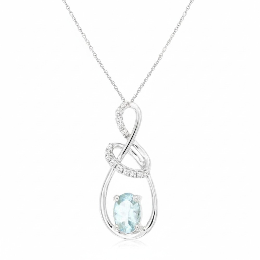 Graceful curves form an open, flowing silhouette that draws the eye downward toward an oval aqua set at the base. The cool blue stone is cradled within polished white gold, its soft color contrasted by a ribbon of round diamonds that arcs through the upper portion of the design. The interplay of smooth metal and diamond accents creates movement and dimension without feeling heavy. The result is an elegant, contemporary pendant that balances light, color, and negative space with quiet sophistication.