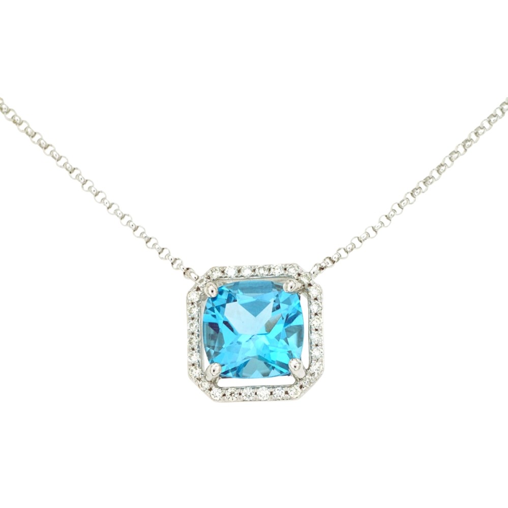 A cushion-cut blue topaz glows with a clear, refreshing brilliance, its facets catching the light with every subtle movement. A delicate halo of diamonds surrounds the center stone, adding crisp sparkle that enhances the vivid blue beneath. The clean, angular frame gives the piece a modern edge, while the suspended design allows the topaz to shine with open luminosity. Soft shimmer from the diamonds along the border creates an elegant balance, making this necklace both graceful and eye-catching.