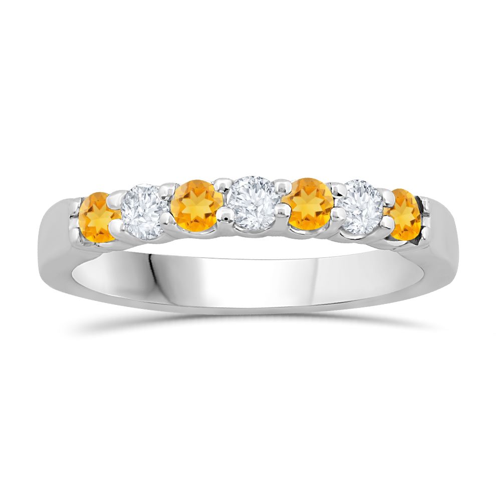 Warm citrine gemstones alternate with bright diamonds across the top of this band, creating a balanced pattern of golden color and crisp sparkle. Each stone is set closely together, giving the design a smooth, continuous flow across the finger. The contrast between the sunny citrine and the diamonds adds depth without feeling heavy. A polished band completes the look, making it easy to wear on its own or layered with other favorites.