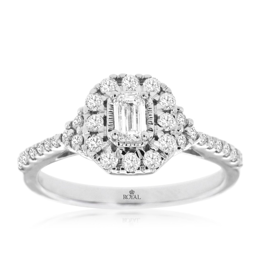 A captivating emerald-cut diamond rests at the center of this exquisite engagement ring, framed by a brilliant halo of round diamonds. The contrast between the sleek geometry of the center stone and the soft sparkle of its halo creates a stunning balance of elegance and light. A pavé-set band completes the design, offering a refined shimmer that enhances the ring’s timeless sophistication.