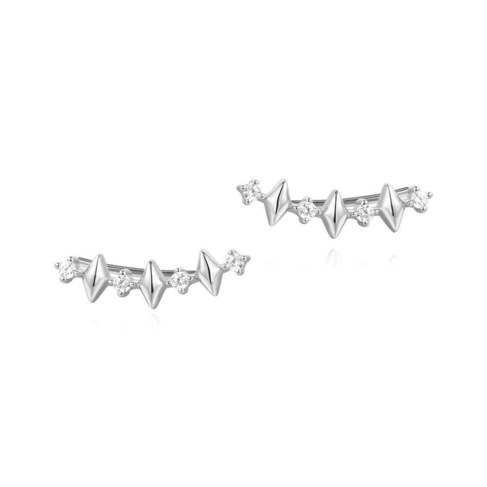 Product Description: Clean white gold forms a refined small hoop silhouette, its front surface fully illuminated with a structured mosaic of diamonds. Rows of round stones frame a vertical line of baguette-cut diamonds through the center, creating contrast in both shape and light return. The result is a crisp, architectural sparkle that feels tailored and intentional rather than overly ornate. Hinged for a close, secure fit, this pair delivers polished brilliance in a compact, everyday-ready profile.