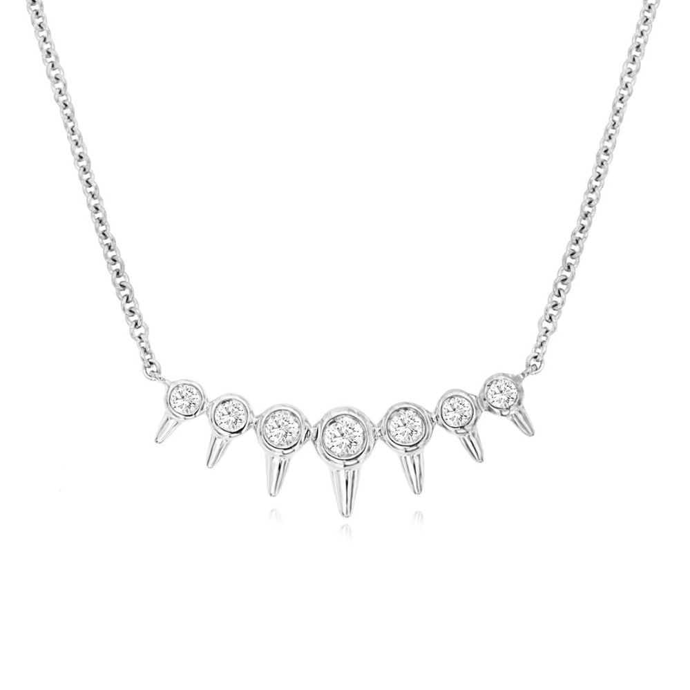 A playful row of bezel-set diamonds brings a fresh, modern edge to this necklace. Each stone is paired with a tapered accent that adds subtle dimension and a touch of movement as the piece catches the light. The graduated layout creates a gentle curve along the neckline, making it easy to layer or wear as a minimalist statement. Clean metalwork keeps the focus on the diamonds’ brightness, giving the necklace a polished, everyday-elegant feel.