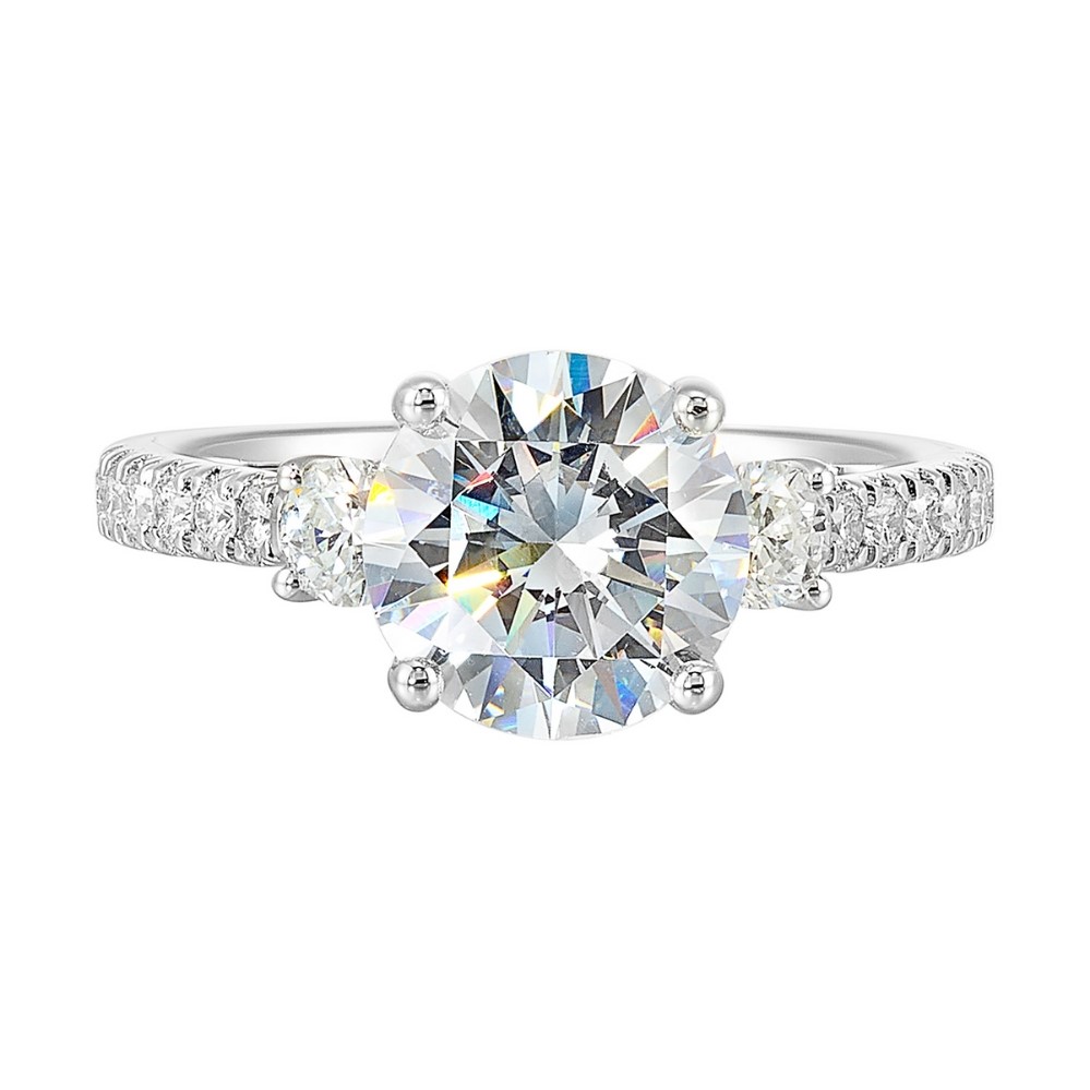 A luminous round center stone takes the spotlight, radiating brilliance from every angle. Flanked by two sparkling side stones, the design creates a graceful balance of light and symmetry. The polished white gold band is accented with a delicate line of pavé-set diamonds, adding texture and shimmer without overpowering the centerpiece. Modern yet timeless, this setting blends elegance with refined detail, perfect for celebrating a love that shines endlessly.