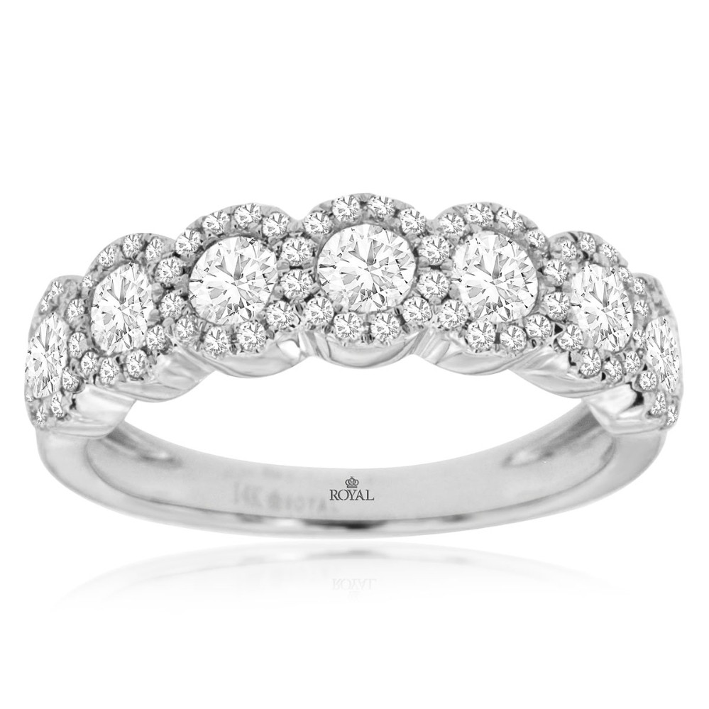 Brilliant clusters of round diamonds form a continuous row of radiance in this elegant wedding band. Each center diamond is surrounded by a shimmering halo, creating a scalloped silhouette that plays beautifully with the light. Set in polished white gold, the design exudes both vintage charm and modern sophistication—making it a timeless complement to any engagement ring or a dazzling statement on its own.