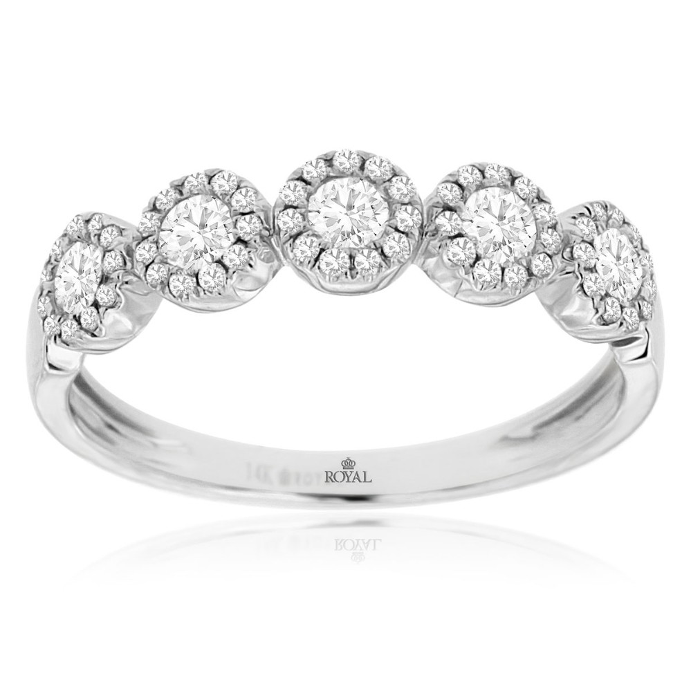 A series of round diamond clusters forms a graceful, scalloped silhouette, each center stone framed by a halo of smaller diamonds for layered brilliance. The repeating pattern creates a soft rhythm across the top of the band, giving it both texture and movement. Set in white gold, the design feels bright and refined, allowing the diamonds to shine with maximum clarity. Elegant yet distinctive, it offers a modern take on a classic diamond band.