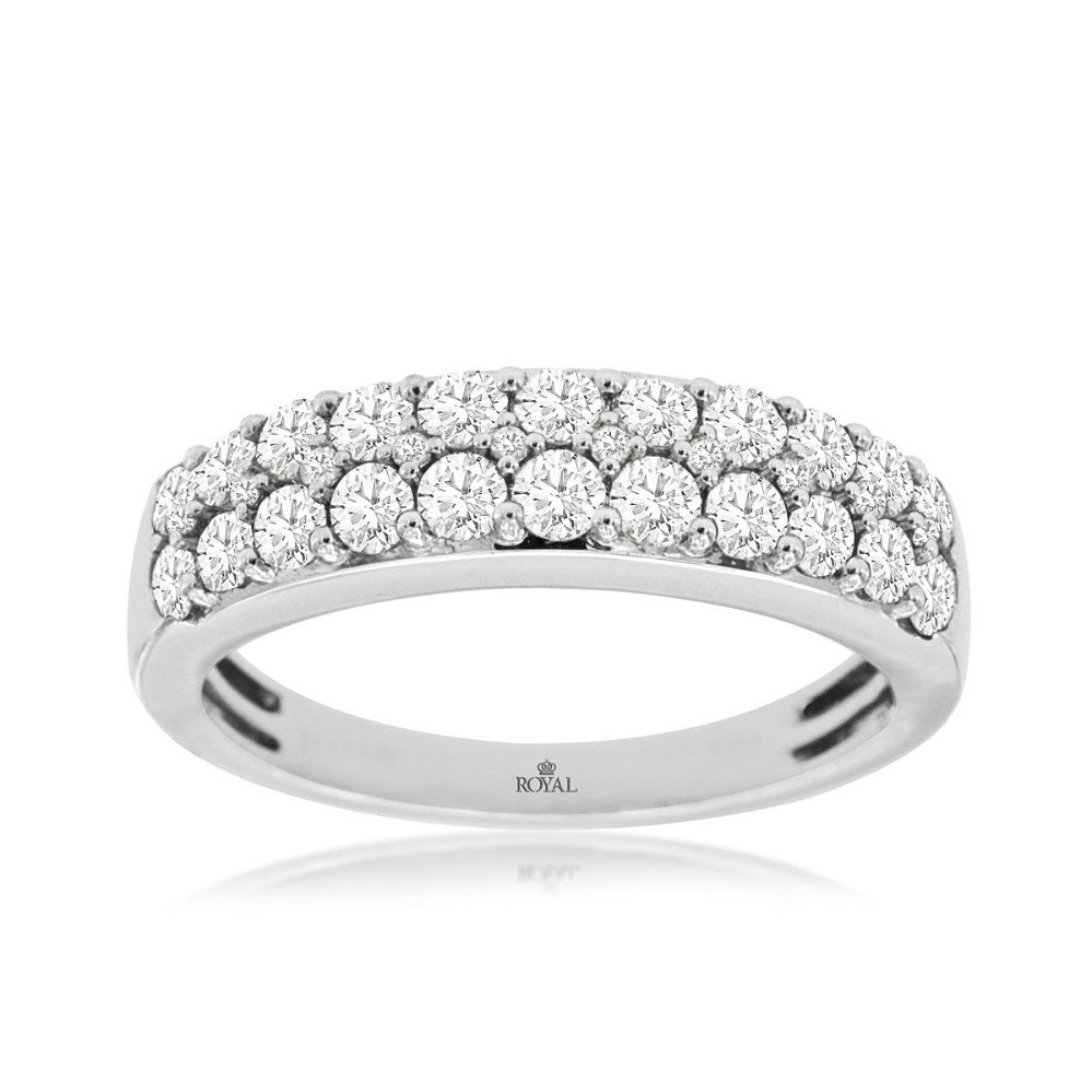 A double row of round diamonds spans the top of this white gold band, each stone expertly prong-set to create a continuous field of brilliance. The low, contoured profile offers both comfort and bold radiance, while the clean symmetry gives it timeless appeal. Perfect as a wedding band or anniversary ring, it radiates a balanced elegance that never fades from style.