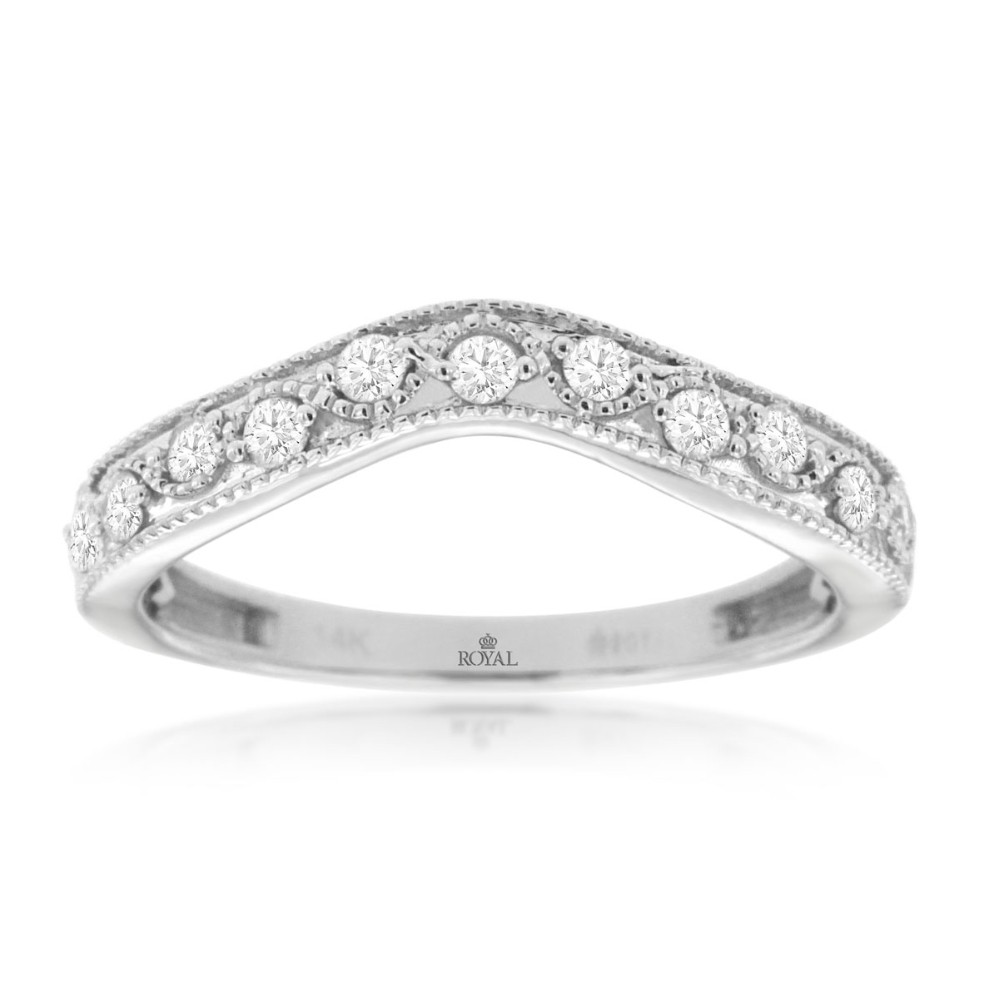 Product Description: Graceful curves and delicate detailing give this band a refined, vintage-inspired presence. A series of round diamonds are set along a g