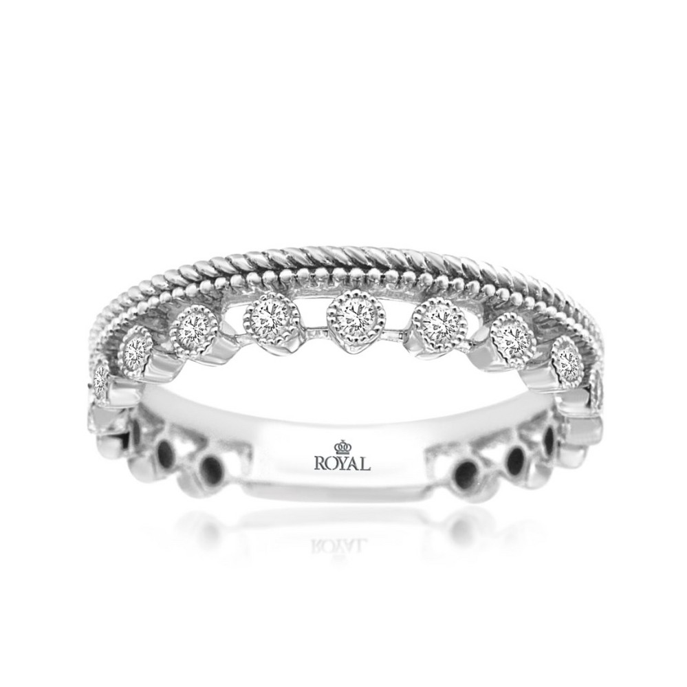 Delicate milgrain edges and polished white gold bring vintage-inspired charm to this diamond wedding band. A series of round diamonds, each framed in soft beaded detail, shimmer along the center for a look that’s both refined and romantic. The openwork design adds lightness and texture, making it a perfect pairing for an engagement ring or an elegant stand-alone statement.