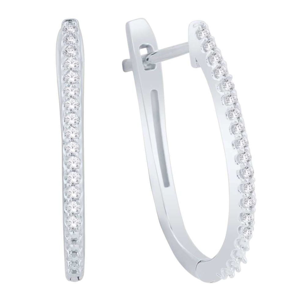 Slender oval hoops in cool 10K white gold parade roughly 0.12 carat of round diamonds along the forward edge, releasing crisp brilliance as the polished interior arc reflects ambient light. The slim squared profile hugs the lobe yet elongates the neckline, while a discreet hinged snap closure clicks firmly into place for worry-free daily wear. Diamond color and clarity are not specified, and exact hoop dimensions aren’t provided.