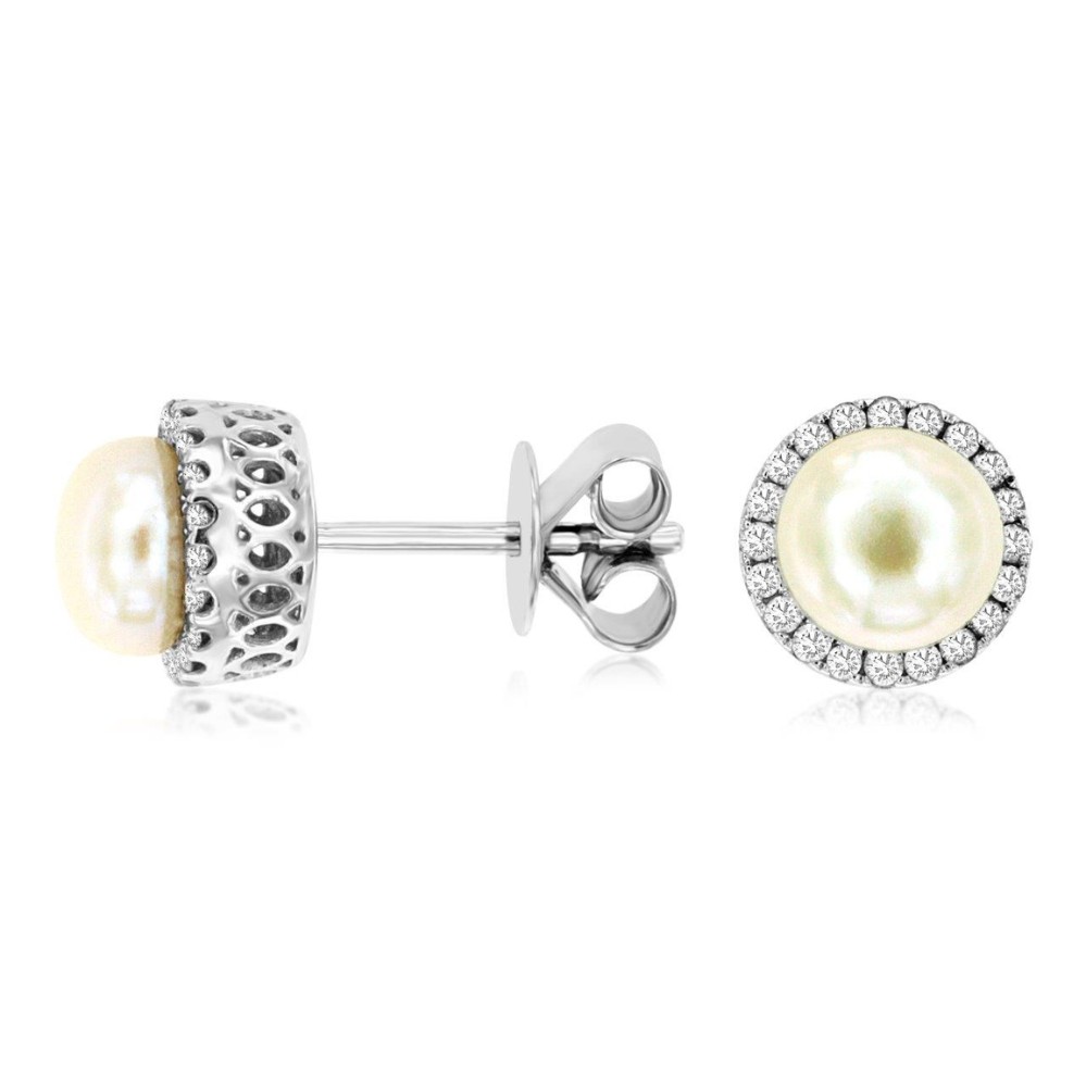 A luminous pearl sits at the center, radiating a soft, natural glow that brings timeless elegance to the design. Surrounding it, a halo of round diamonds adds bright sparkle, creating a refined contrast against the smooth surface of the pearl. The white gold setting enhances the clean, classic look while the detailed gallery adds subtle texture from the side view. Polished and sophisticated, these earrings offer effortless beauty for any occasion.
