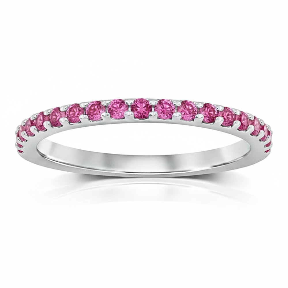 A slender band comes alive with a row of vivid pink tourmaline, each stone closely set to create a smooth sweep of color across the top. The bright pink tones offer a lively contrast against the polished white metal, catching light with every movement. Designed with a low profile, it sits comfortably on the finger and layers effortlessly with other rings. Worn on its own, it delivers a refined pop of color that feels playful yet polished.