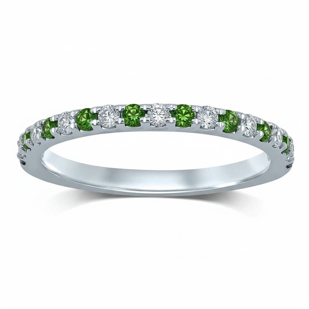 Product Description: Bright green tsavorite gemstones alternate with crisp white diamonds, creating a lively pattern of color and sparkle across the band. Each stone is evenly spaced, giving the ring…