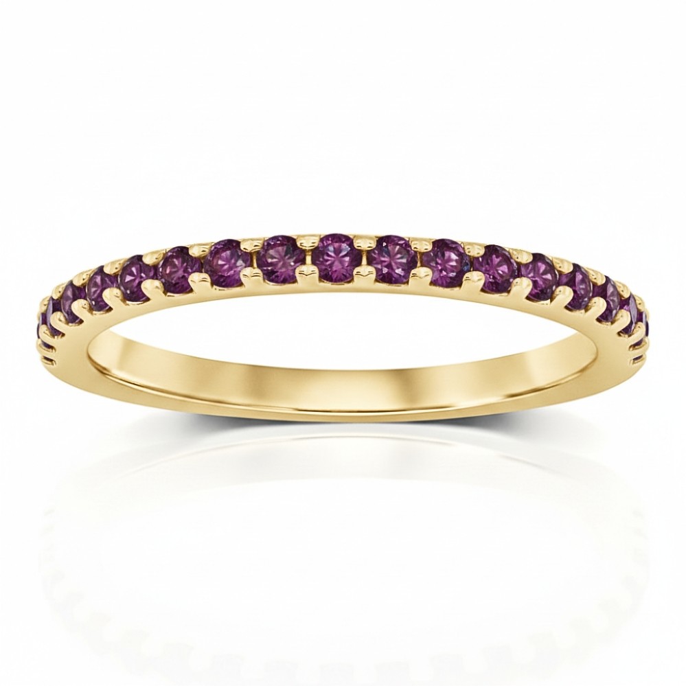 A slim yellow gold band is set with a continuous row of lab-created alexandrite, each stone displaying rich violet and plum tones across the top of the ring. The low-profile setting allows the color to take center stage while keeping the silhouette clean and comfortable. Subtle prongs create a rhythmic pattern that adds texture without distracting from the gemstones. Elegant on its own and effortless to stack, this ring brings a refined pop of color to everyday wear.