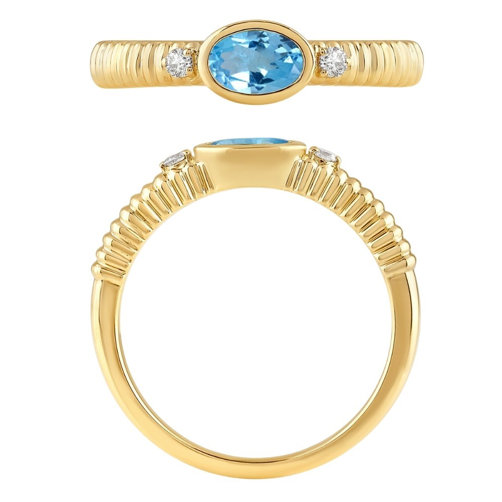 This captivating 10K yellow gold ring features a bezel-set oval blue topaz as its centerpiece, showcasing a brilliant sky-blue hue that evokes tranquility and elegance. Two brilliant round diamonds flank the topaz, adding sparkle and sophistication to complement the striking center stone. The textured ribbed band provides a sophisticated architectural detail that catches the light beautifully, while the secure bezel setting offers both protection and a sleek, modern aesthetic perfect for any occasion.