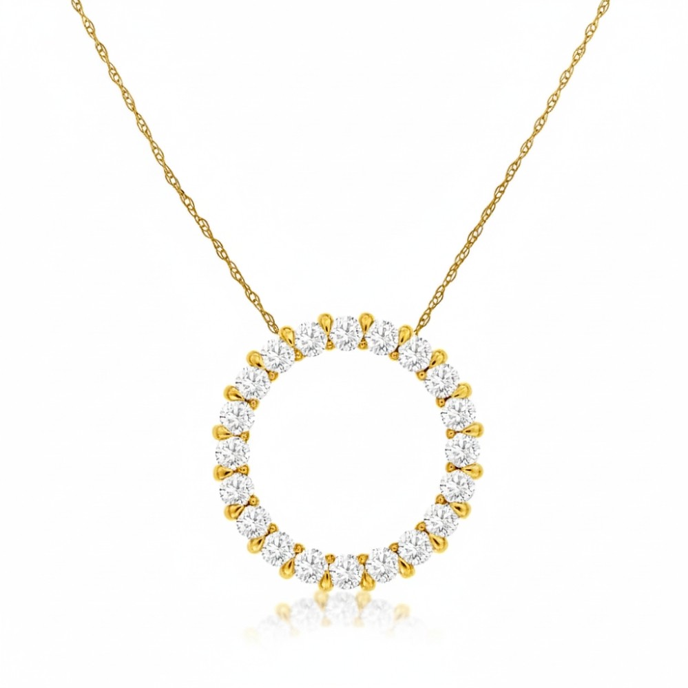 Radiate timeless elegance with this stunning circular pendant, meticulously crafted in warm yellow gold. The classic silhouette features a continuous row of brilliant diamonds that capture and reflect light from every angle. Suspended from a delicate, shimmering gold chain, this sophisticated piece offers a graceful touch of luxury perfect for both daily wear and special occasions.