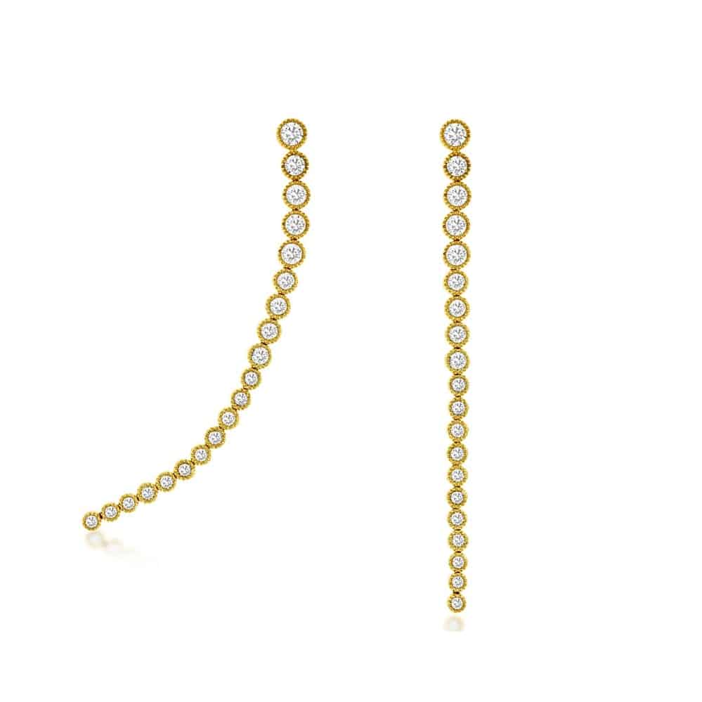 A sleek cascade of round diamonds glimmers down the length of these elegant yellow gold drop earrings. Each stone is bezel-set with delicate milgrain edges, creating a vintage-inspired texture that catches light with every turn. The slender silhouette elongates the neck with refined brilliance, blending timeless artistry and modern minimalism in a design made to turn heads.