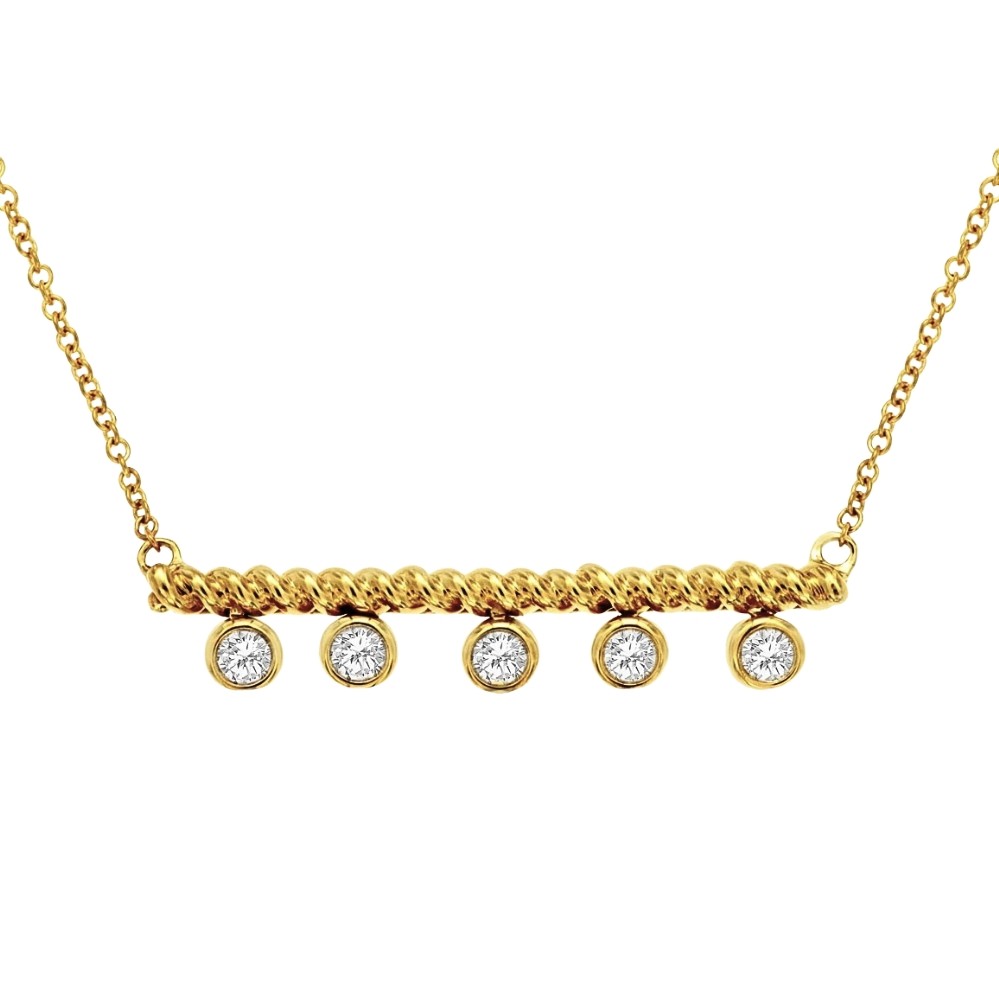A rich yellow gold chain supports a textured horizontal bar, creating a bold yet refined focal point at the neckline. Suspended beneath the bar, five bezel-set diamonds drop in a delicate row, each catching light with crisp, controlled brilliance. The contrast between the twisted gold detail and the smooth diamond settings adds depth and dimension. Designed to sit gracefully along the collarbone, this piece delivers modern elegance with effortless wearability.