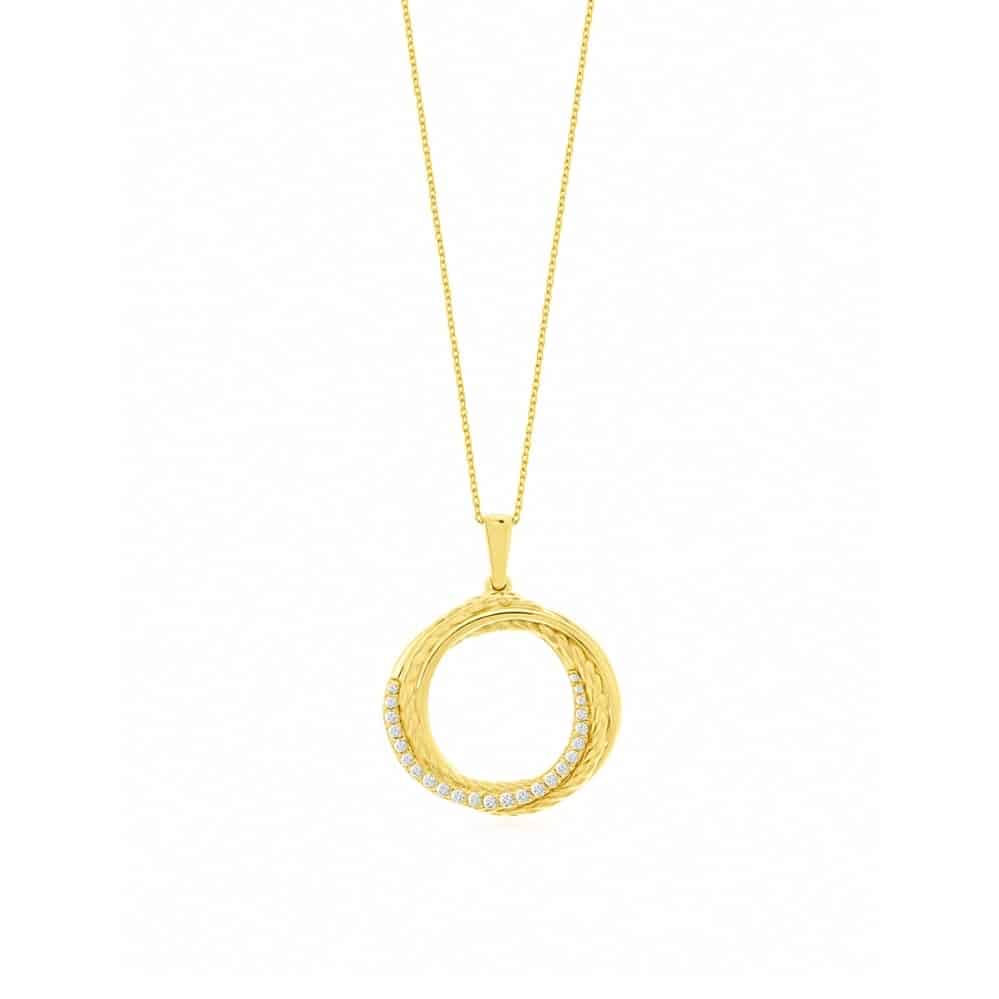 A swirl of polished yellow gold curves into an open circle, its braided texture giving the pendant depth and quiet movement. Along the inner arc, a line of diamonds adds crisp sparkle that plays beautifully against the warm metal. The asymmetry feels modern yet timeless, creating a piece that stands out on its own or layers effortlessly with other necklaces.