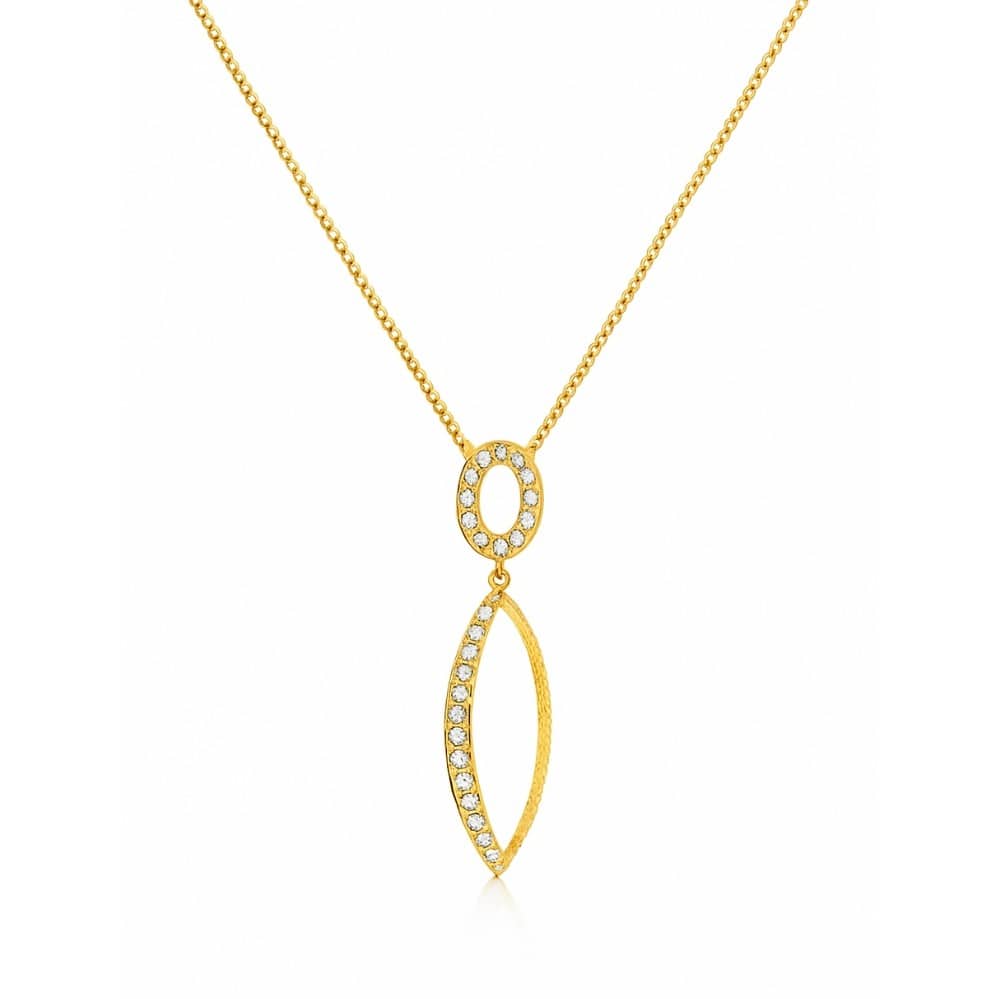 A graceful silhouette defines this pendant, where two diamond-lined oval forms create a refined sense of movement. The upper loop anchors the design with a soft shimmer, while the elongated lower shape narrows to a delicate point, adding height and elegance. Its open construction keeps the look light, letting each diamond catch flashes of brightness as the piece shifts effortlessly along the neckline.