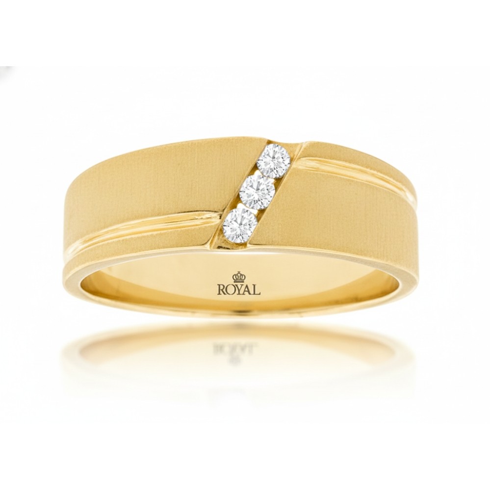 A smooth yellow gold band presents a satin-finished surface with clean, modern lines and a solid, confident feel. Three round diamonds are set on a subtle diagonal, introducing a refined point of brilliance without interrupting the band’s streamlined profile. Polished edges frame the brushed center, creating quiet contrast and visual depth. The design feels balanced and composed, offering comfortable everyday wear with understated sophistication. Classic and restrained, it delivers timeless appeal with a contemporary edge.