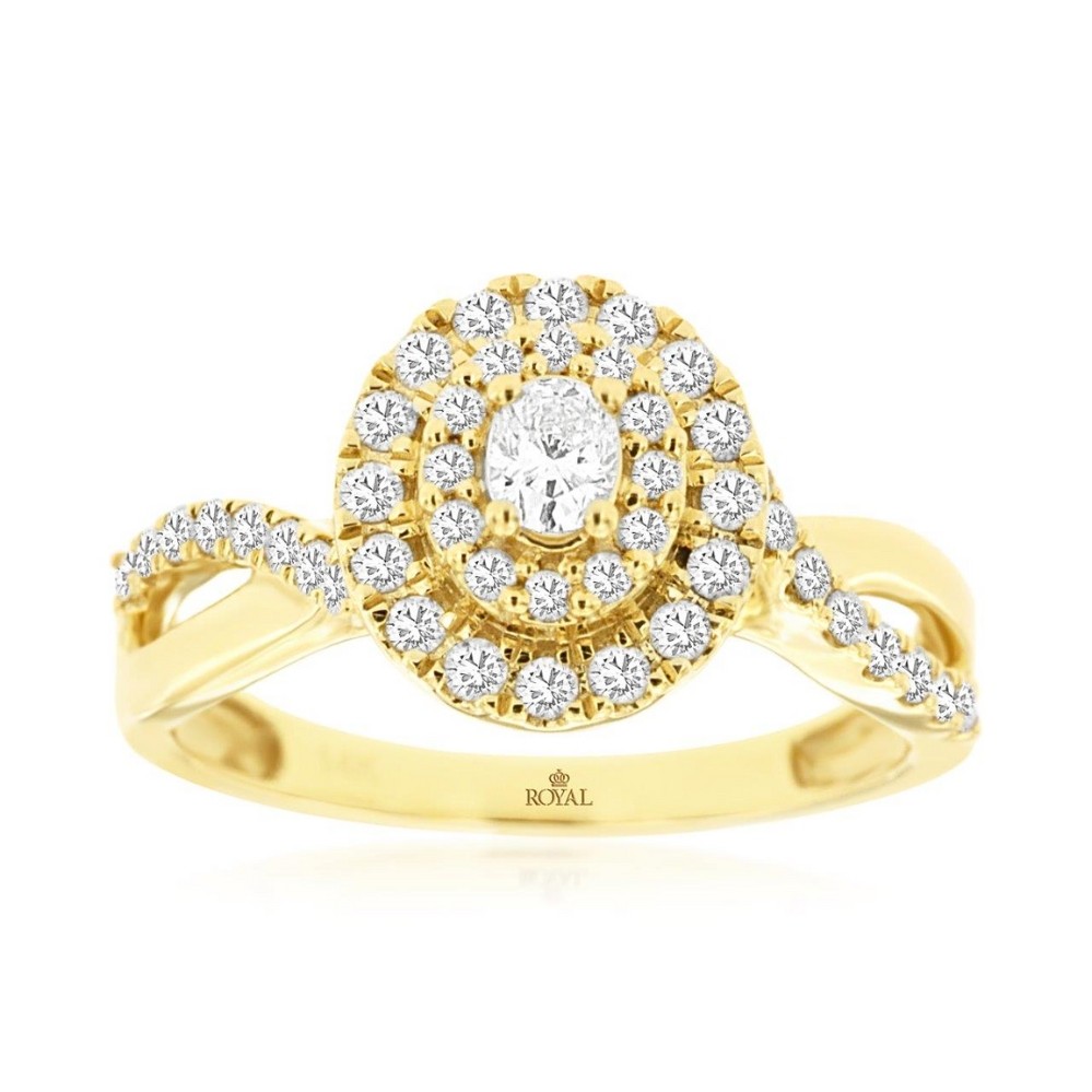 A captivating cluster of diamonds takes center stage in this radiant yellow gold design. The oval center is surrounded by two sparkling halos, each diamond meticulously set to create a full, brilliant bloom of light. A split-shank band lined with diamonds adds graceful symmetry and shimmer, offering a luxurious balance of sparkle and warmth. Bold yet elegant, it’s a timeless statement of refinement and brilliance.