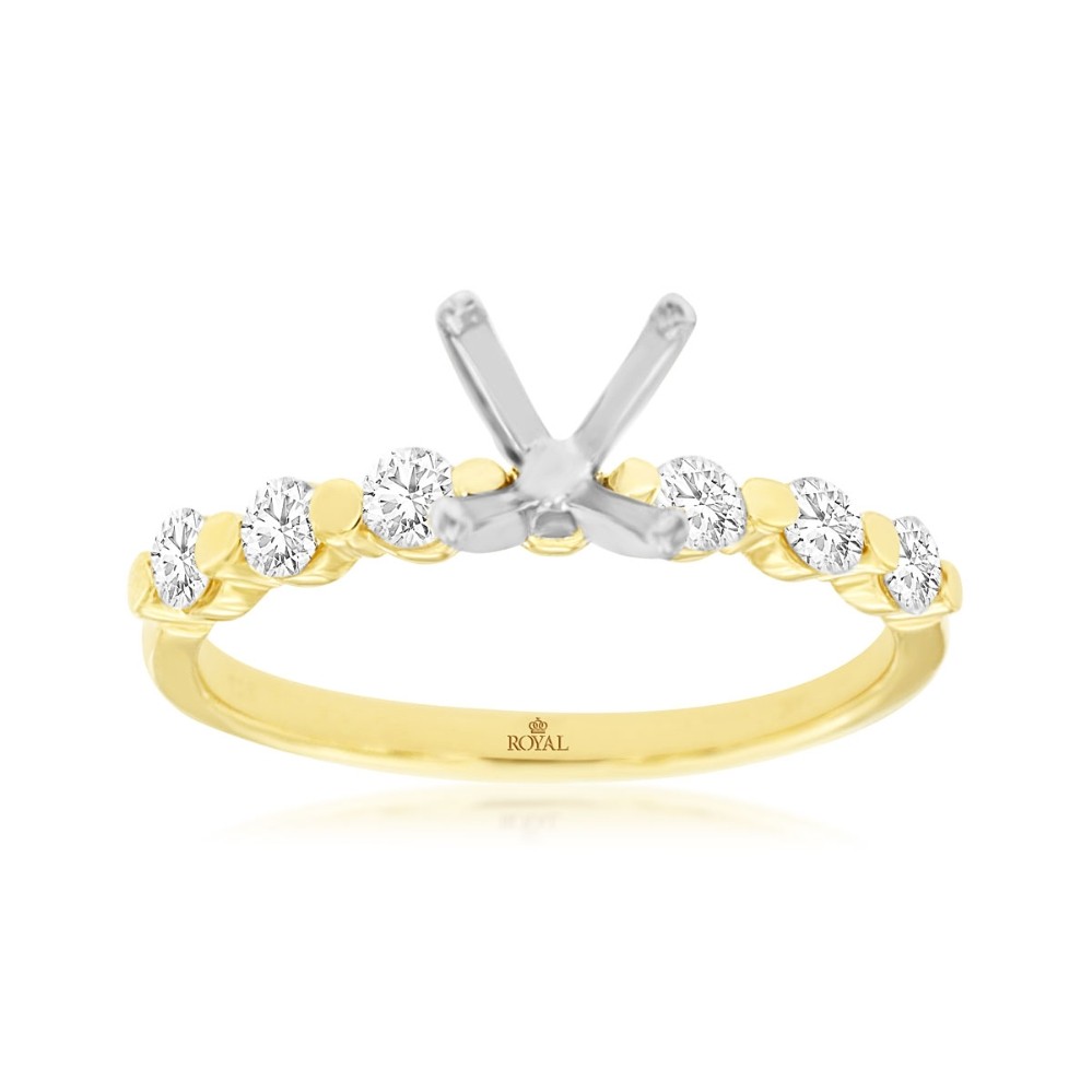 Polished yellow gold meets a classic diamond-accented band in this elegant semi-mount ring. Each round diamond is set with precision, creating a luminous pathway that draws the eye toward the center setting—ready to hold the diamond or gemstone of your choice. The white gold head offers a subtle contrast, enhancing brilliance and allowing full customization for a timeless engagement design.